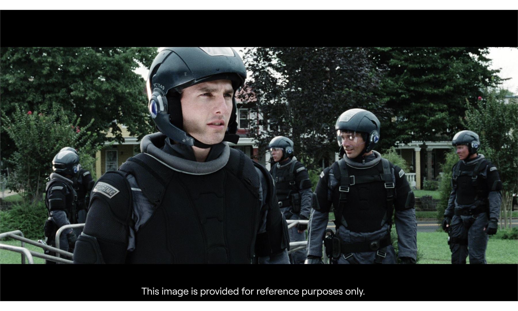 Cops working within the PreCrime unit, including its chief, John Anderton (Tom Cruise), wore helmets as part of their armor when out in the field, stopping crimes before they occurred.