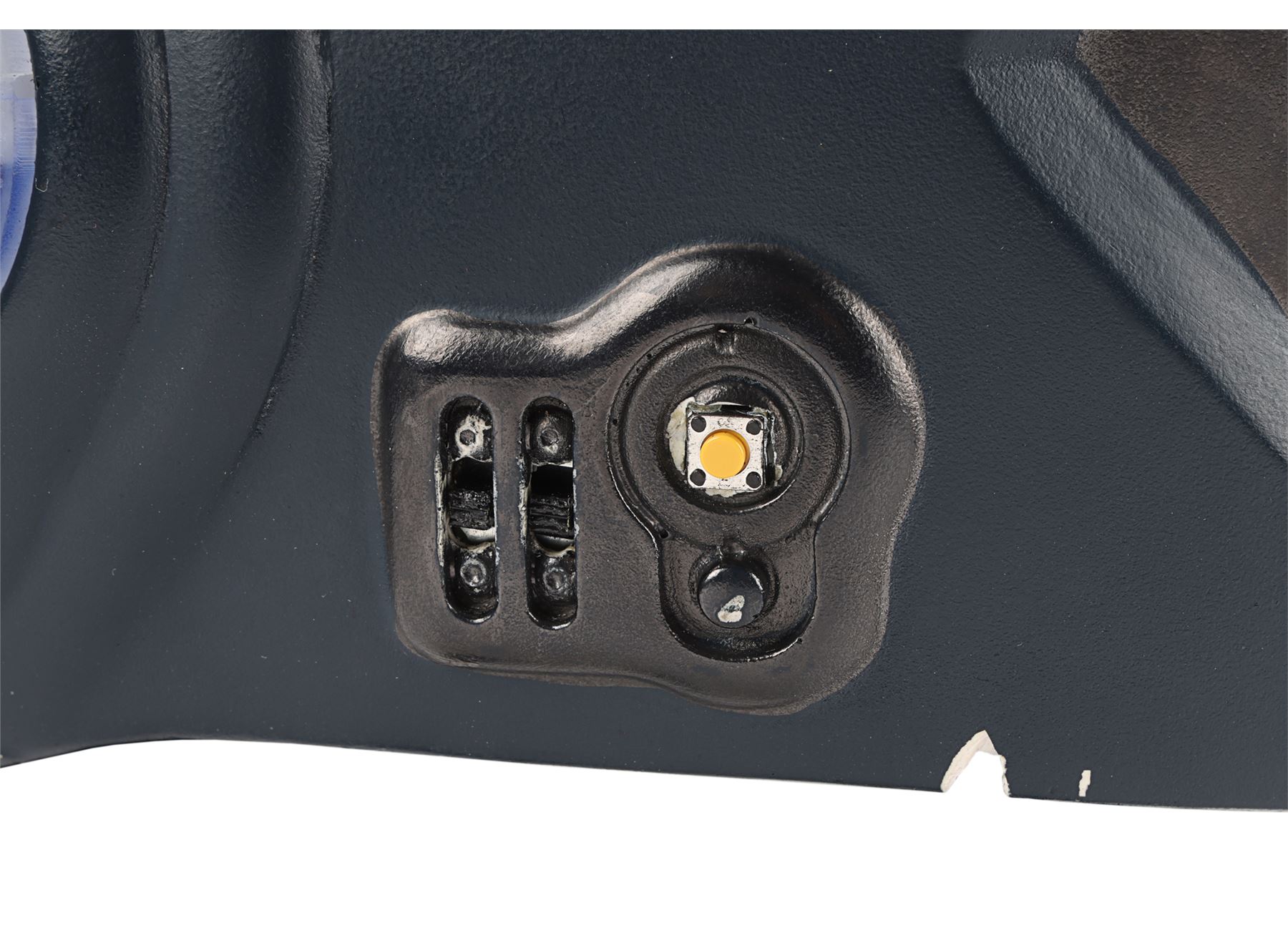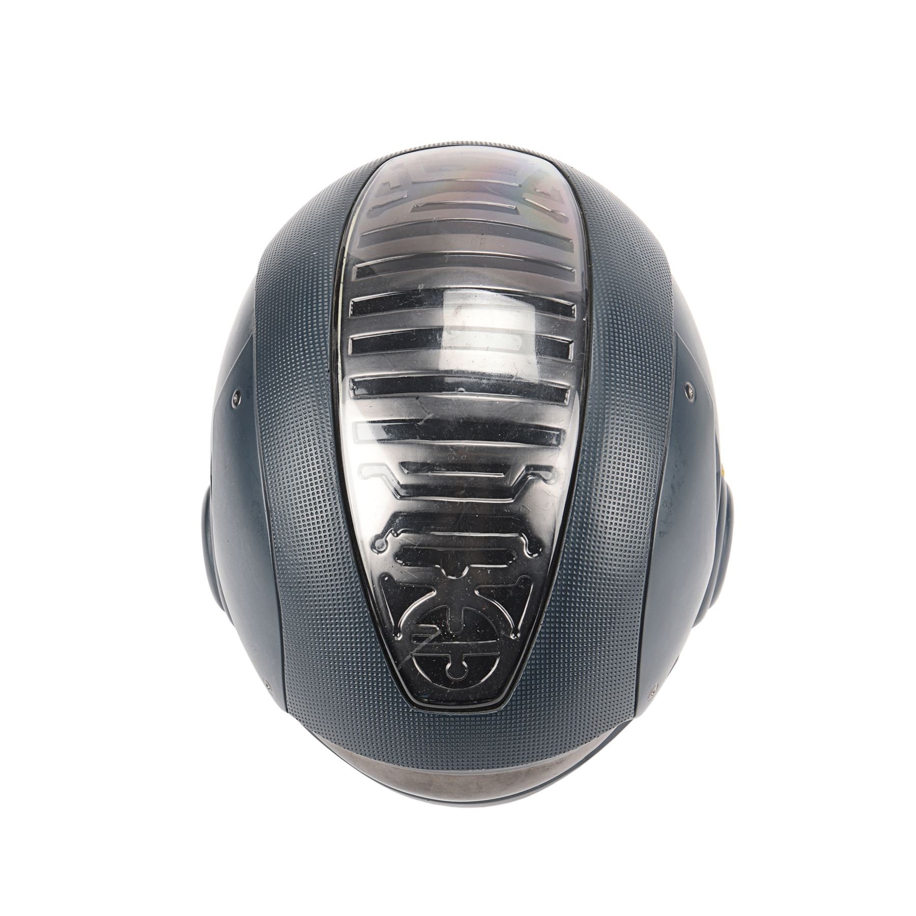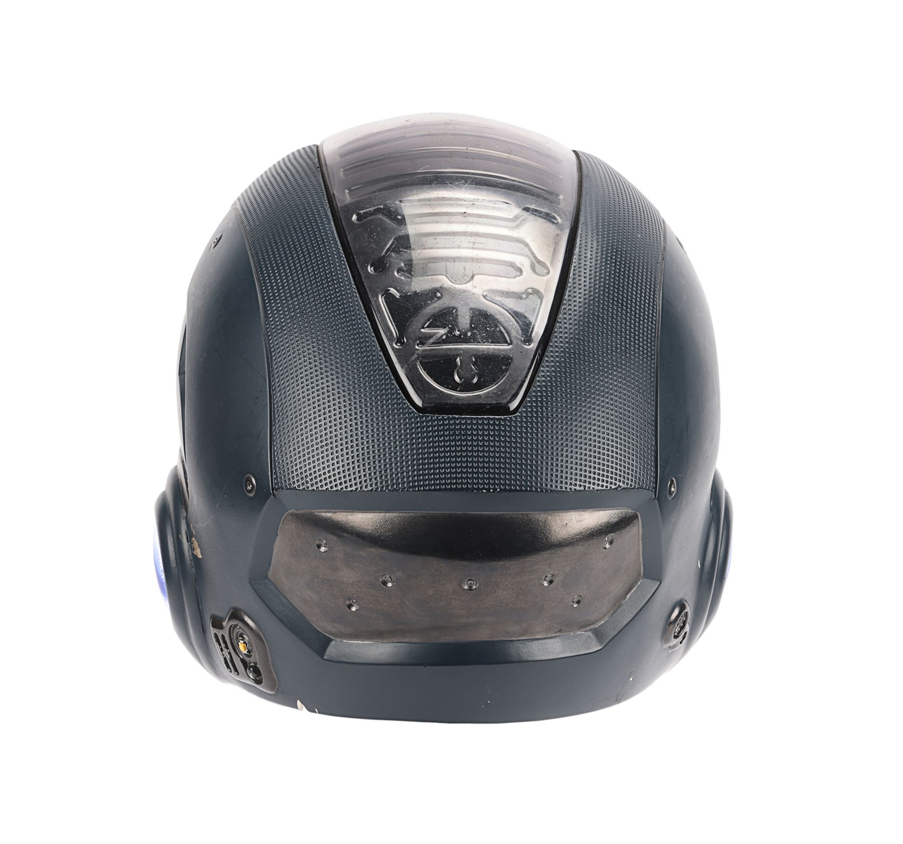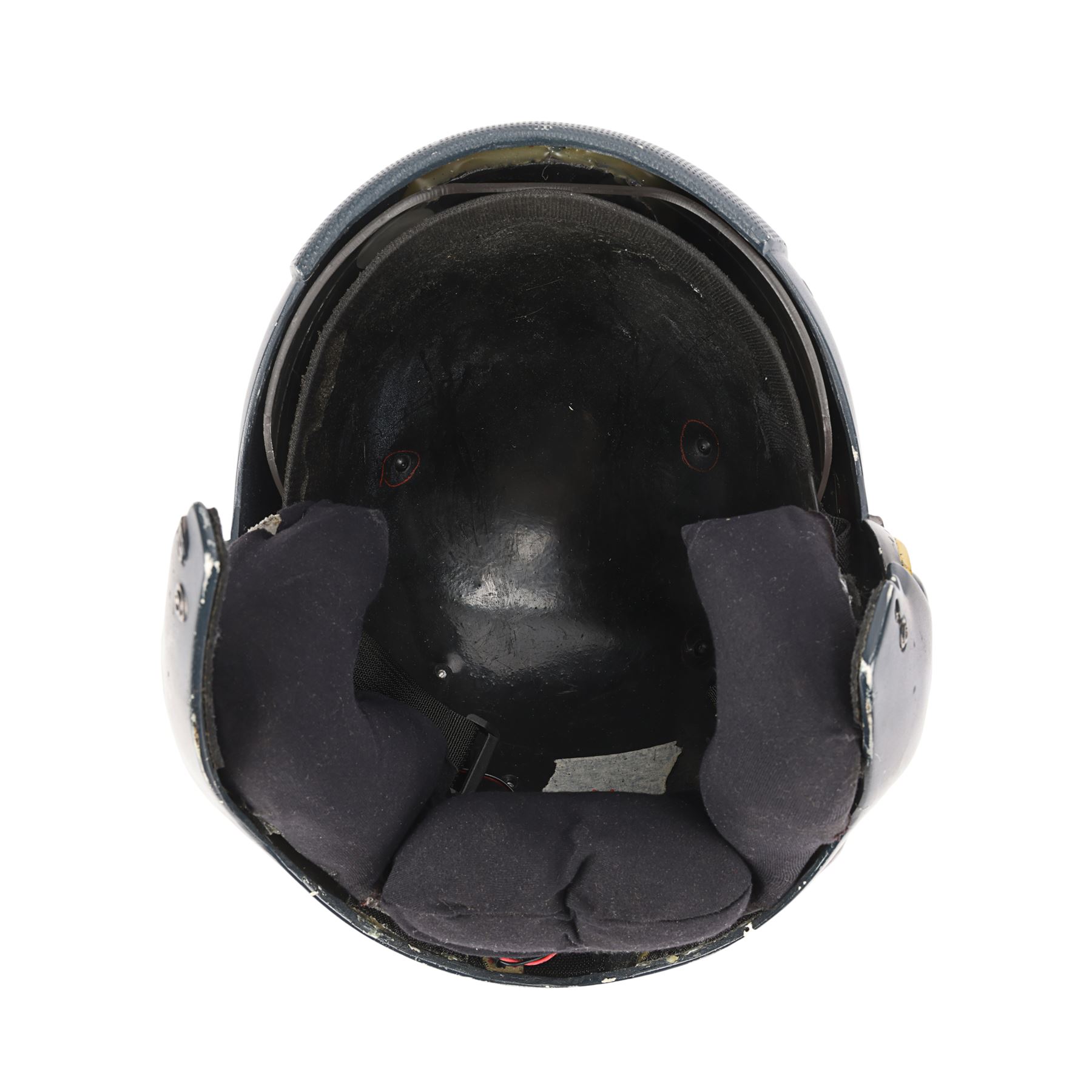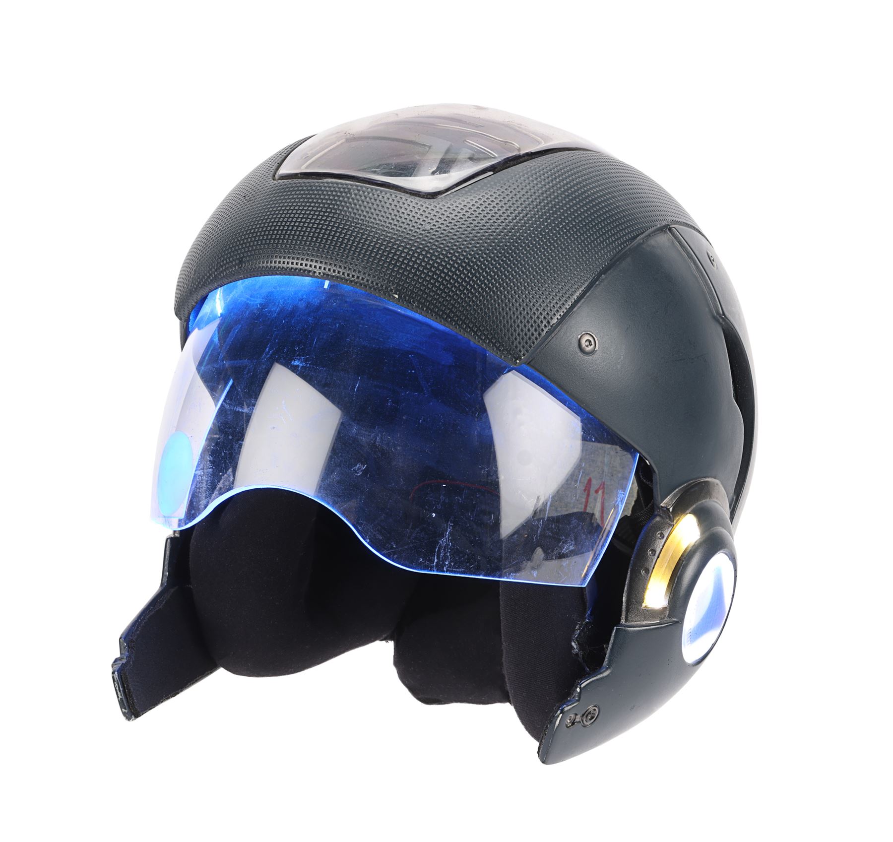 This black and navy fiberglass helmet features top vacuum-formed plastic panels and a transparent acrylic visor. The servo-powered drop-down visor is deployed, retracted, and illuminated with blue LED lights, while earpieces on either side of the jaw, which feature the precrime unit logo, also light up. These functions operate by three buttons on the side of the helmet, which are powered by concealed 9V batteries stored in the back of the helmet behind a removable piece of padding. "11" is handwritten in red ink on a label stuck to the inside of the helmet. The helmet exhibits minor chips in places. Dimensions: 12.25" x 9.75" x 11.75" (31.25 cm x 25 cm x 29.75 cm)