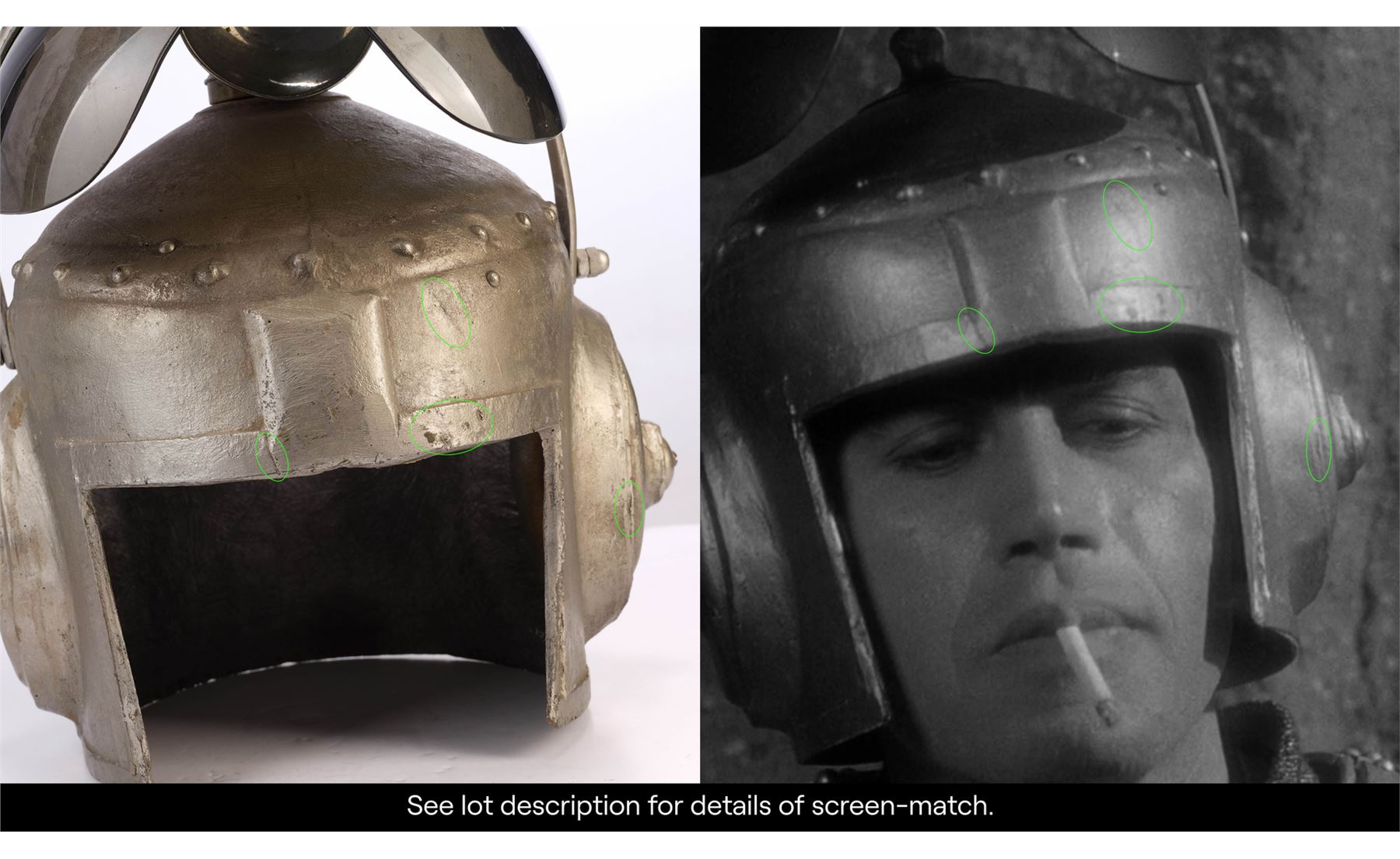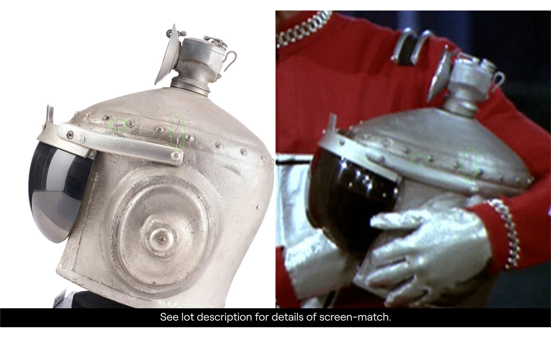 This helmet was originally used in the television series The Outer Limits' Season 2 episode "Soldier," where the helmet screen-matches to when it was worn by Quarlo Clobregnny (Michael Ansara) due to its unique structural features seen in close-up images, as well as how the brim is cut out and the various knicks at the mandibles.