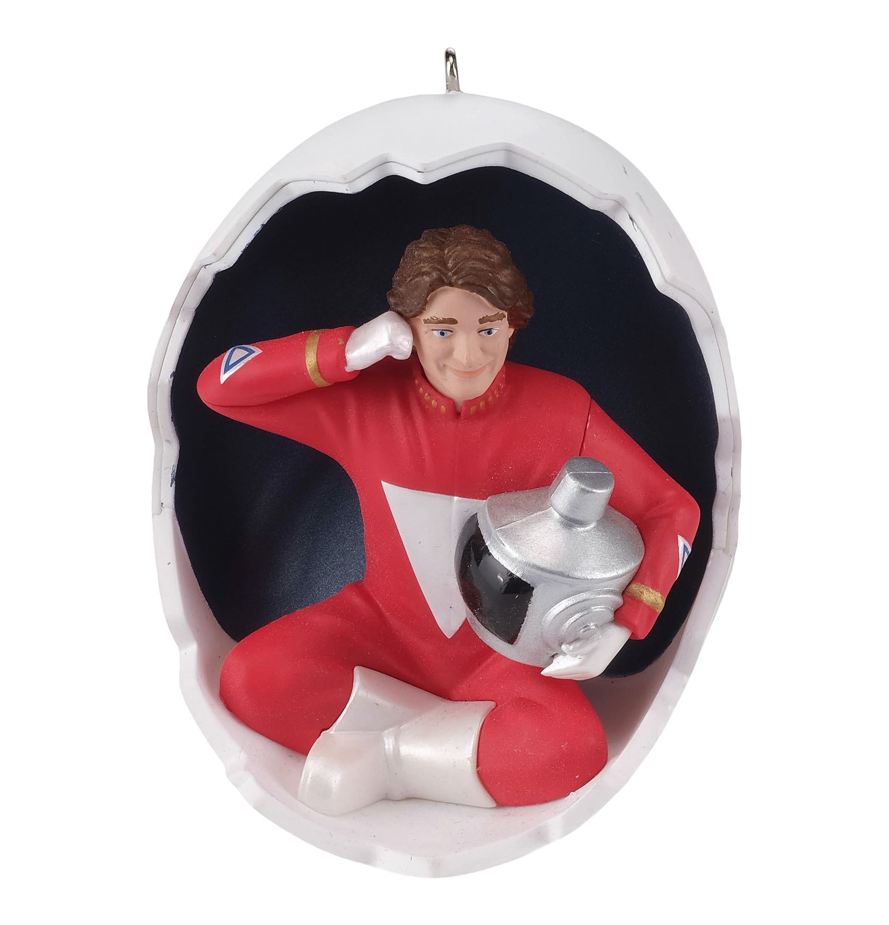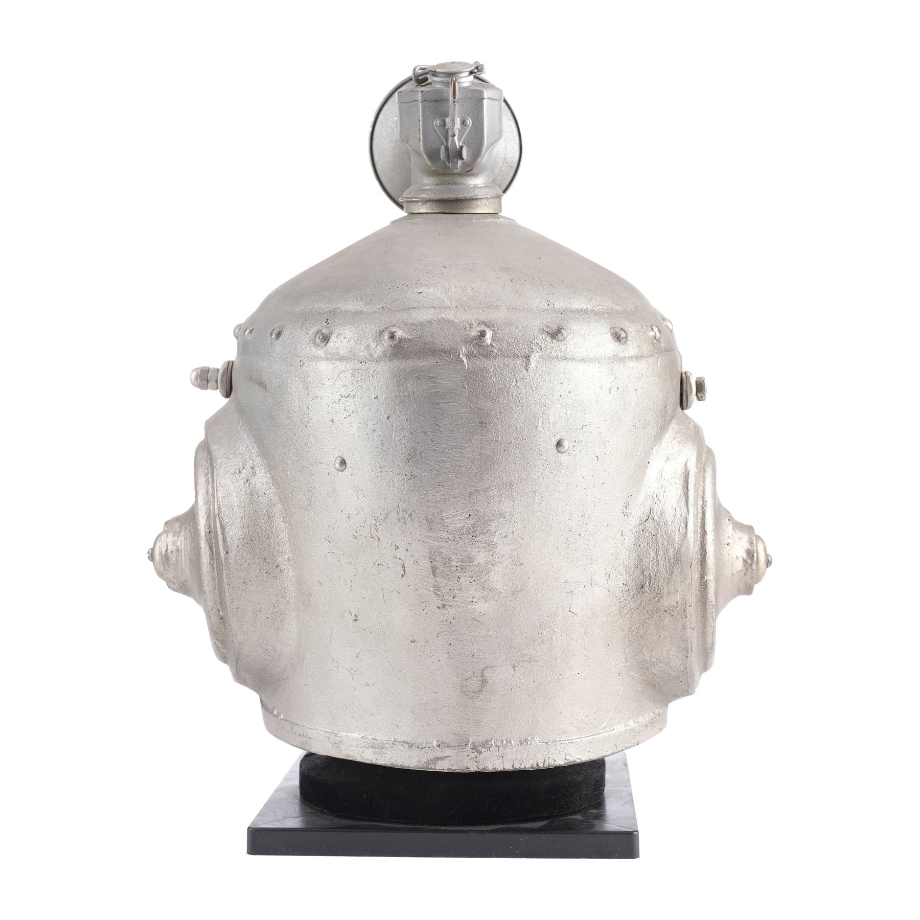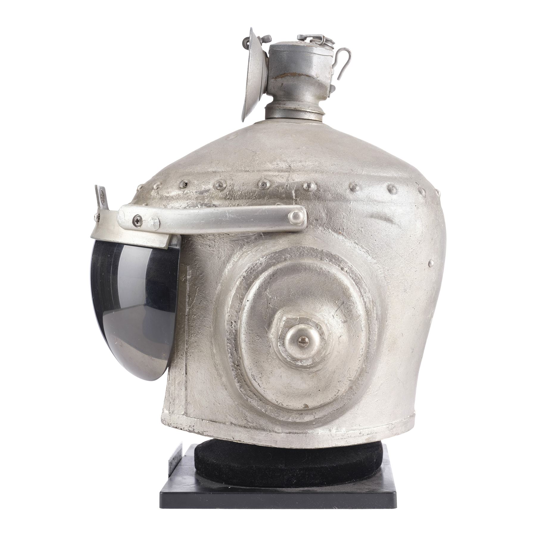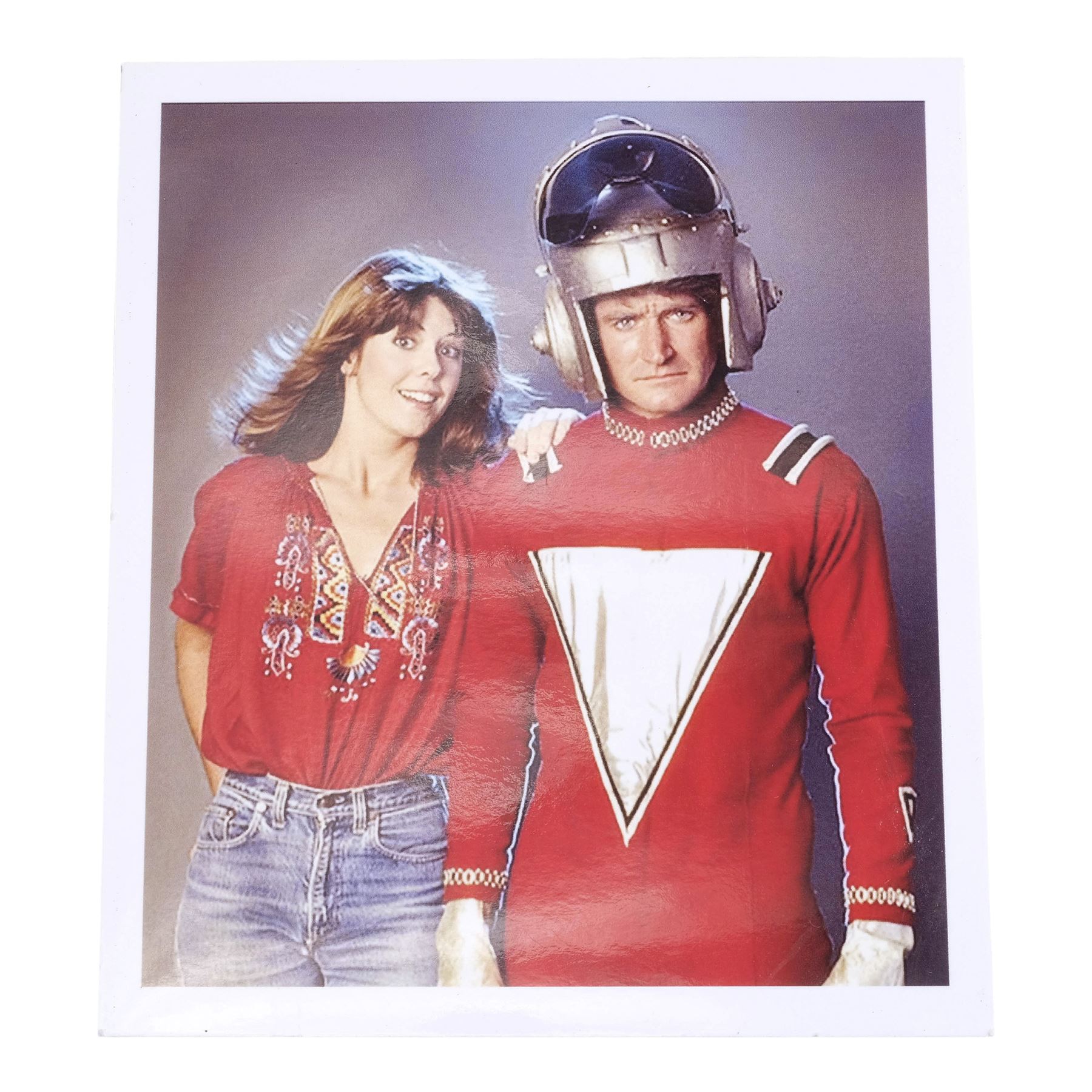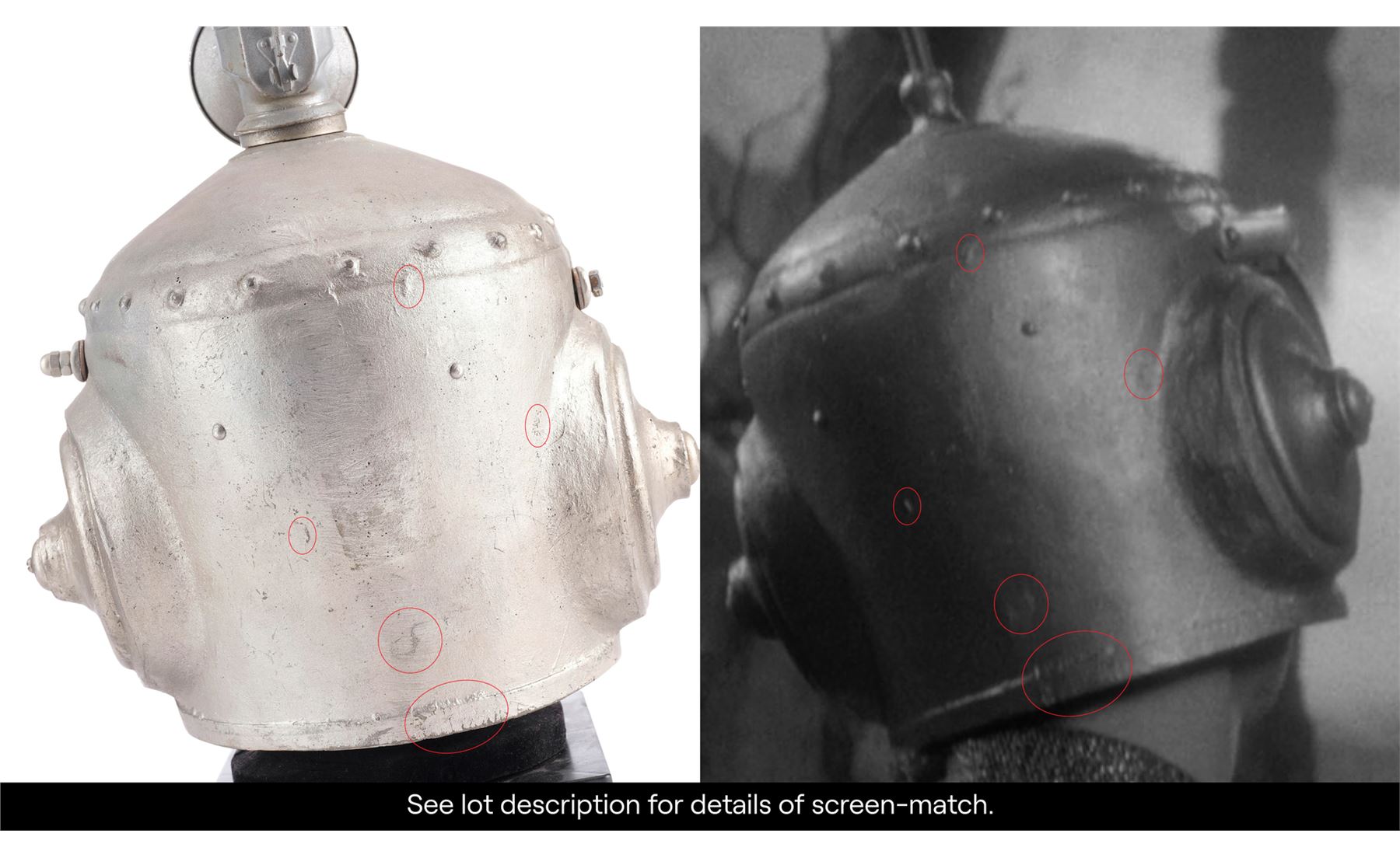 This cast fiberglass shell helmet features sculptural rivets and metal components painted silver-color with a retractable and black tinted Plexiglass faceplate visor, a helmet rig carved "CRABBE" and "#2," and earpieces. The original antenna on its top from The Outer Limits is no longer included and was converted to a parabolic sensor for use by Mork. Included with this lot is a black foam mannequin head mounted to black acrylic base; a magnetic color print photo of Mindy and Mork with his helmet; and a painted resin Christmas ornament of Mork in his egg-shaped spaceship holding a helmet. This lot exhibits aging from production use.
