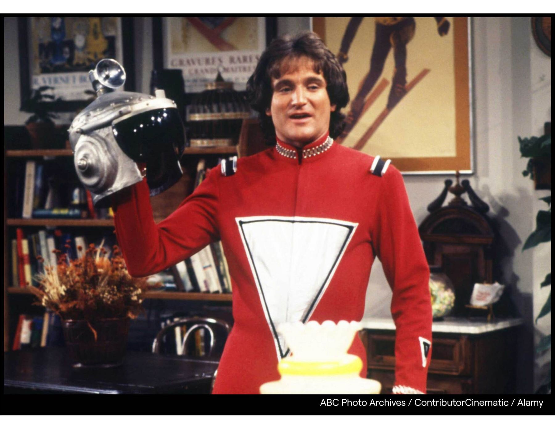 The helmet was later passed on to Williams to use as Mork in his cameo appearance in the television series Happy Days episode "Mork" and later for the series Mork and Mindy. The helmet screen-matches to the Season 1 episode "Mork Goes Public" by an area of paint on the left side of the forehead that is visibly seen when the visor is raised, as well as marking on the inside of the ear speaker when Mindy McConnell (Pam Dawber) holds the helmet.