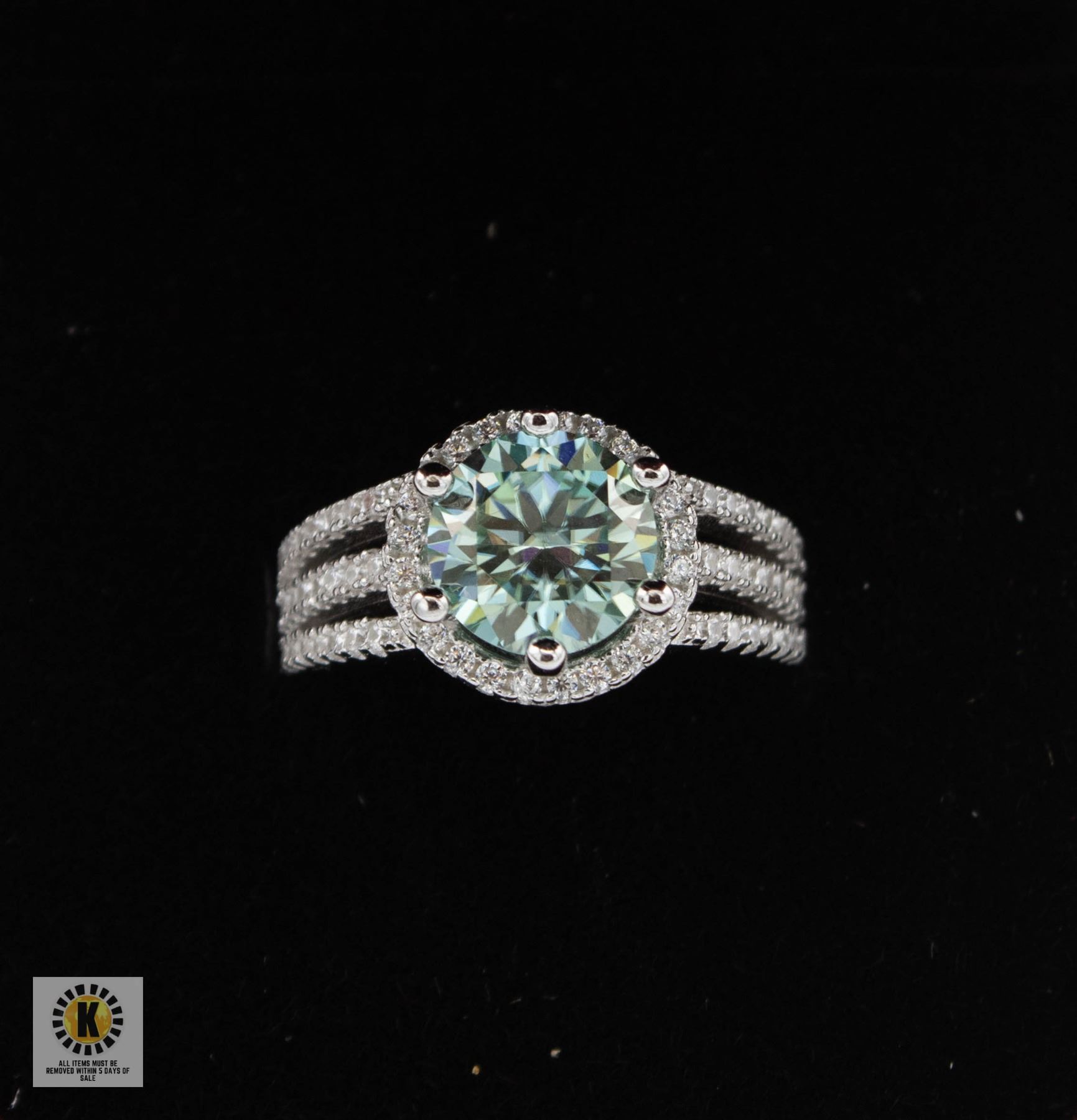 MOISSANITE STONE VVS FANCY LIGHT BLUE COLOR WITH 84 ROUND BRILLIANT CUT CUBIC ZIRCONIA SET IN ROUND HALO AND SET IN THE SHANK SET IN 925 SILVER RING SIZE 5 RETAIL VALUE $1,100.00 **ALL ITEMS MUST BE REMOVED BY 5PM SATURDAY, APRIL 12TH 2025. ALL REMAINING ITEMS WILL BE SUBJECT TO A $6.00 PER DAY STORAGE CHARGE. ANY ITEMS REMAINING AFTER MONDAY, APRIL 28TH 2025 WILL BE CONSIDERED FORFEITED. NO REFUNDS WILL BE ISSUED FOR FORFEITED ITEMS. TO SCHEDULE A PICK UP APPOINTMENT CLICK HERE