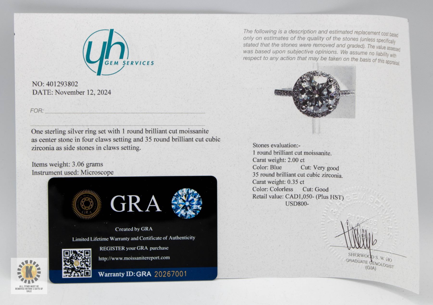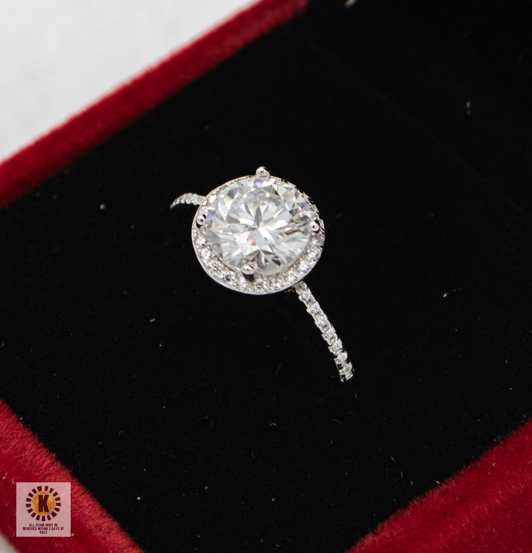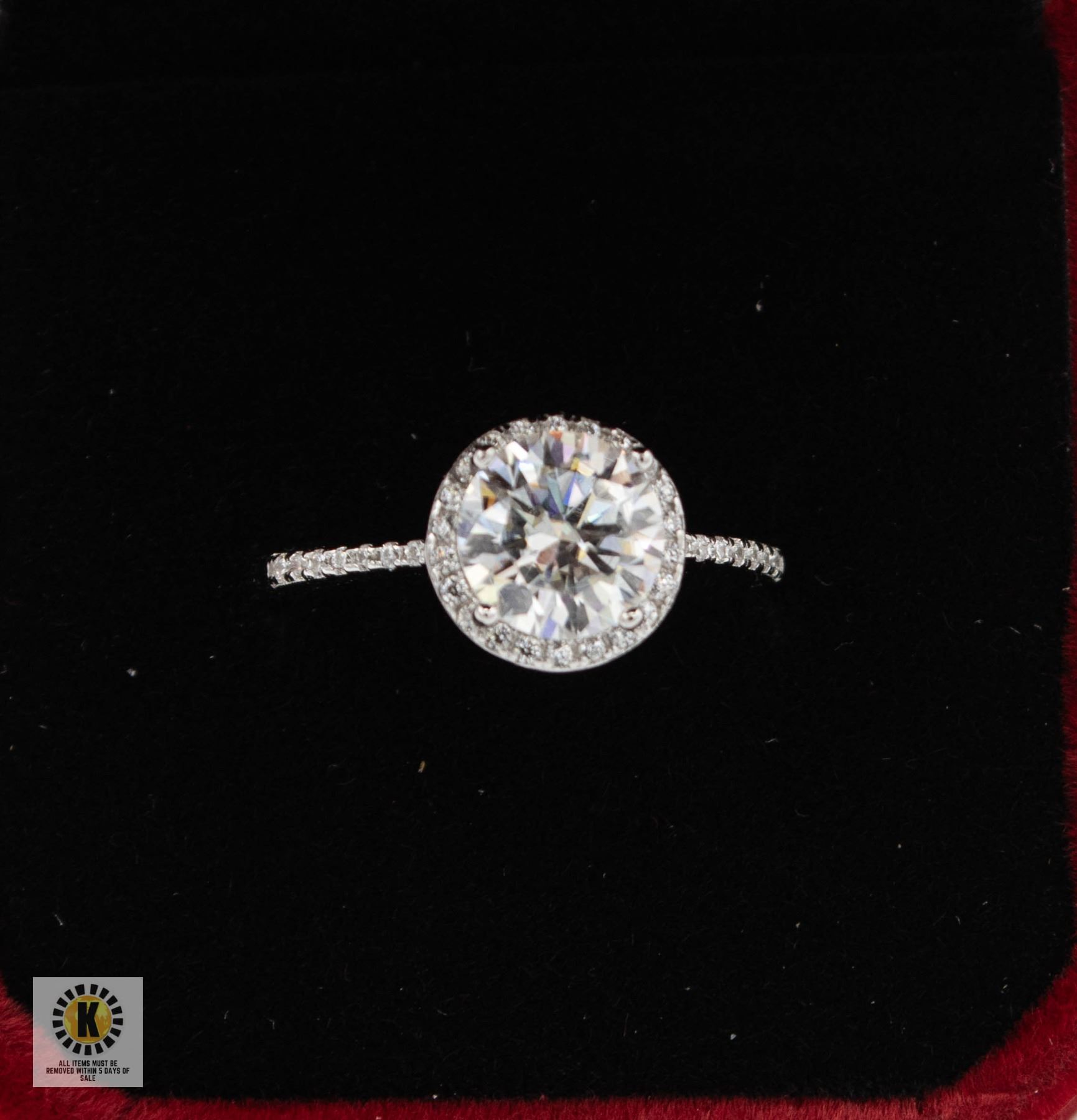 MOISSANITE STONE VVS D COLOR WITH 35 ROUND BRILLIANT CUT CUBIC ZIRCONIA SET IN ROUND HALO AND SET IN THE SHANK SET IN 925 SILVER RING SIZE 7.25 RETAIL VALUE $1,050.00 **ALL ITEMS MUST BE REMOVED BY 5PM SATURDAY, APRIL 12TH 2025. ALL REMAINING ITEMS WILL BE SUBJECT TO A $6.00 PER DAY STORAGE CHARGE. ANY ITEMS REMAINING AFTER MONDAY, APRIL 28TH 2025 WILL BE CONSIDERED FORFEITED. NO REFUNDS WILL BE ISSUED FOR FORFEITED ITEMS. TO SCHEDULE A PICK UP APPOINTMENT CLICK HERE
