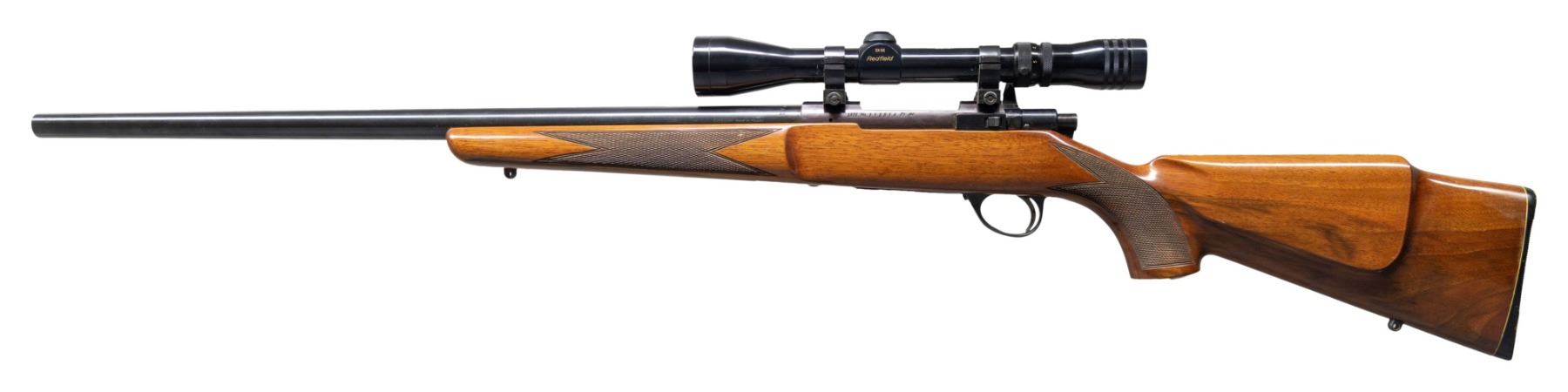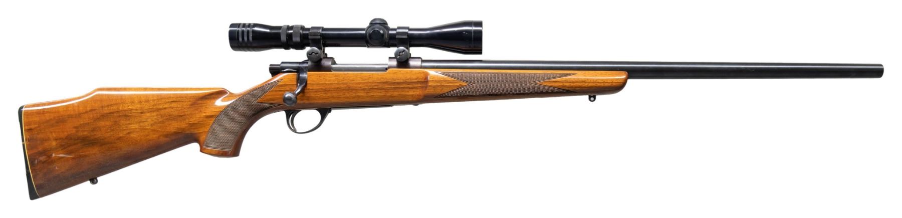ACTION RIFLE. Cal. 243 Win. S# 113514. Mfg. between 1972-1974. Heavy 23" bbl. has The Garcia Corp import mark. Redfield 3x-9x, Wideview duplex scope on tip off rings. L579 Medium action. Checkered Sporter walnut stock . CONDITION: very good to near excellent appearance showing light handling wear. Very good bore. Scope has very good appearance with serviceable optics. (25-3577/MD). CURIO. $500-700.