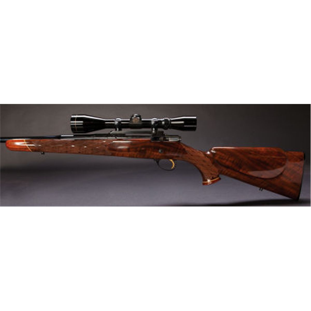 **.243 Win. Browning FN High Power Medallion Bolt Action Rifle with Telescopic Sight. Serial no. 9848A8. .243 Winchester. 22 1/4-inch barrel. No iron sights. Blued bolt action engraved with stylized floral designs. Floorplate with stylized floral designs with a ram's head and banner in gold. Gold plated trigger. Single recoil bolts. Skipline checkered pistolgrip stock of figured walnut. Rosewood fore-end tip and grip cap. Cheekpiece. Make's buttplate. Sling eyes. Leupold Vari-X II 3-9 with cross hairs on a one piece Redfield mount. Condition: Excellent, showing very little use. Metal shows 99% bluing. Excellent bore. Stock shows very few light marks.