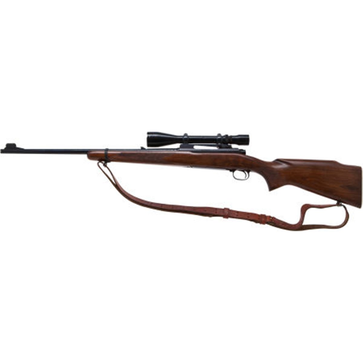 .243 Winchester Pre 64 M70 Featherweight Bolt Action Rifle with Telescopic Sight. Serial no. 379729. .243 Winchester. 22-inch barrel with standard iron sights. Blued pre 64 action. Checkered pistolgrip Monte Carlo stock of straight grain walnut. Checkered aluminum buttplate. Sling. Bausch and Lomb Balvar 8 telescopic sight. Twin circles and a post reticule. Buehler one piece mount adjustable for windage and elevation. Condition. Excellent. Barrel and action show 99% bluing. Bolt knob shows 40-50% blue. Excellent bore. Clear optics. Stock shows a few light marks. NRA FIREARMS FOR FREEDOM PROGRAM