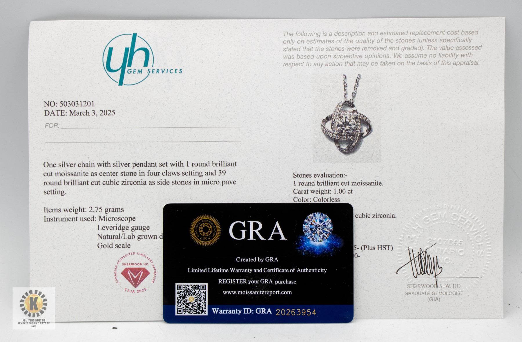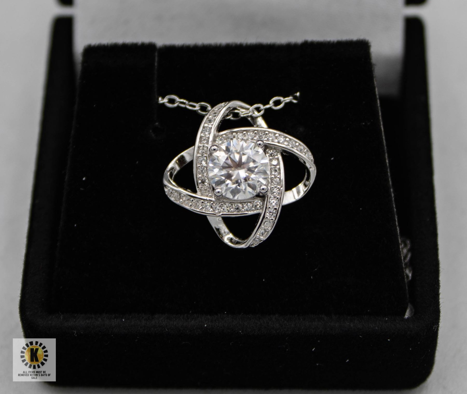 MOISSANITE STONE VVS D COLOR SET IN CENTER WITH 39 ROUND BRILLIANT CUT CUBIC ZIRCONIAS SET IN DUAL OVAL HALOS SET IN 925 SILVER PENDANT RETAIL VALUE $775.00 **ALL ITEMS MUST BE REMOVED BY 5PM SATURDAY, APRIL 12TH 2025. ALL REMAINING ITEMS WILL BE SUBJECT TO A $6.00 PER DAY STORAGE CHARGE. ANY ITEMS REMAINING AFTER MONDAY, APRIL 28TH 2025 WILL BE CONSIDERED FORFEITED. NO REFUNDS WILL BE ISSUED FOR FORFEITED ITEMS. TO SCHEDULE A PICK UP APPOINTMENT CLICK HERE