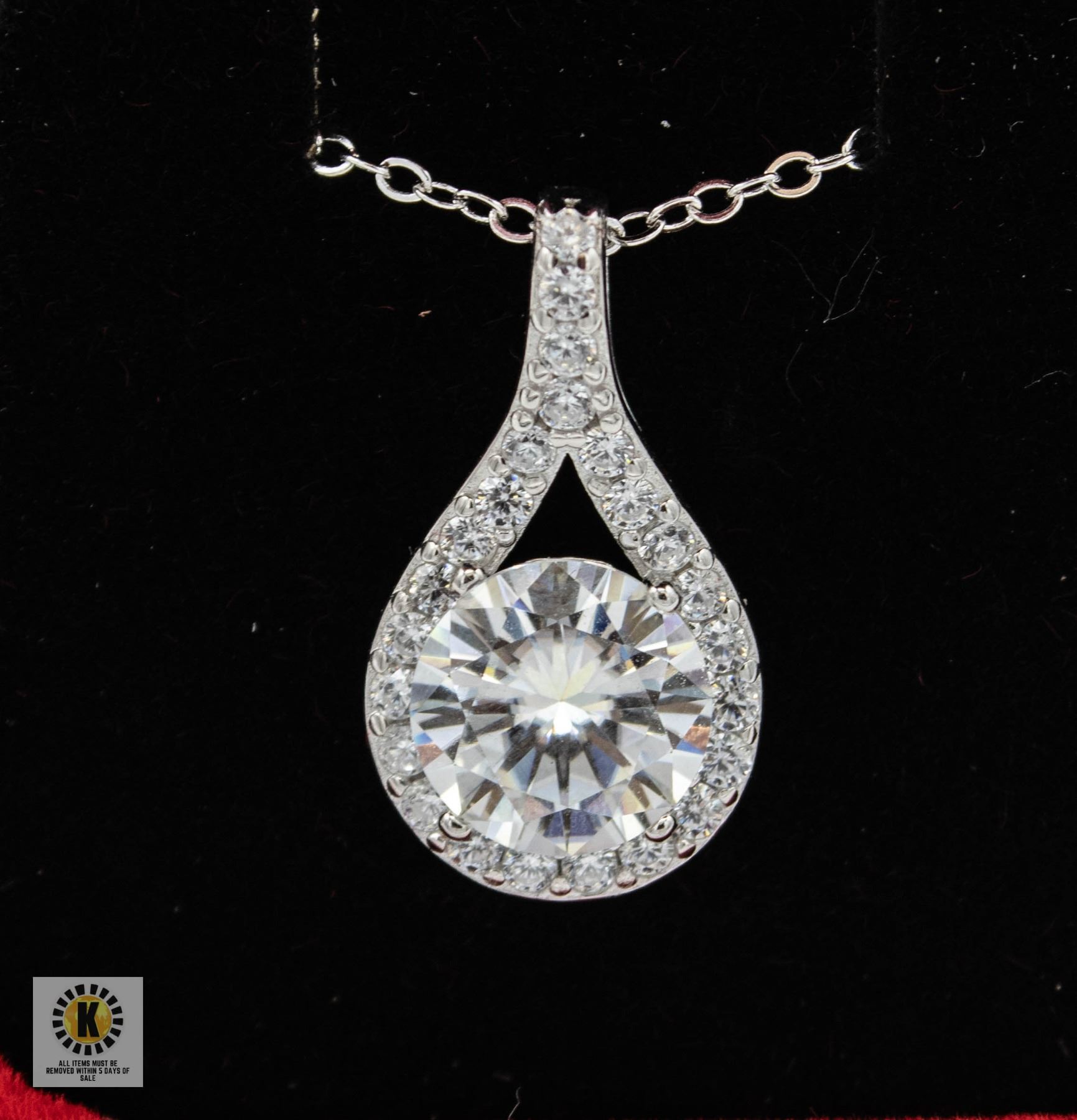 MOISSANITE STONE VVS D COLOR SET IN CENTER WITH 24 ROUND BRILLIANT CUT CUBIC ZIRCONIAS SET IN TEAR DROP HALO SET IN 925 SILVER PENDANT RETAIL VALUE $1,375.00 **ALL ITEMS MUST BE REMOVED BY 5PM SATURDAY, APRIL 12TH 2025. ALL REMAINING ITEMS WILL BE SUBJECT TO A $6.00 PER DAY STORAGE CHARGE. ANY ITEMS REMAINING AFTER MONDAY, APRIL 28TH 2025 WILL BE CONSIDERED FORFEITED. NO REFUNDS WILL BE ISSUED FOR FORFEITED ITEMS. TO SCHEDULE A PICK UP APPOINTMENT CLICK HERE