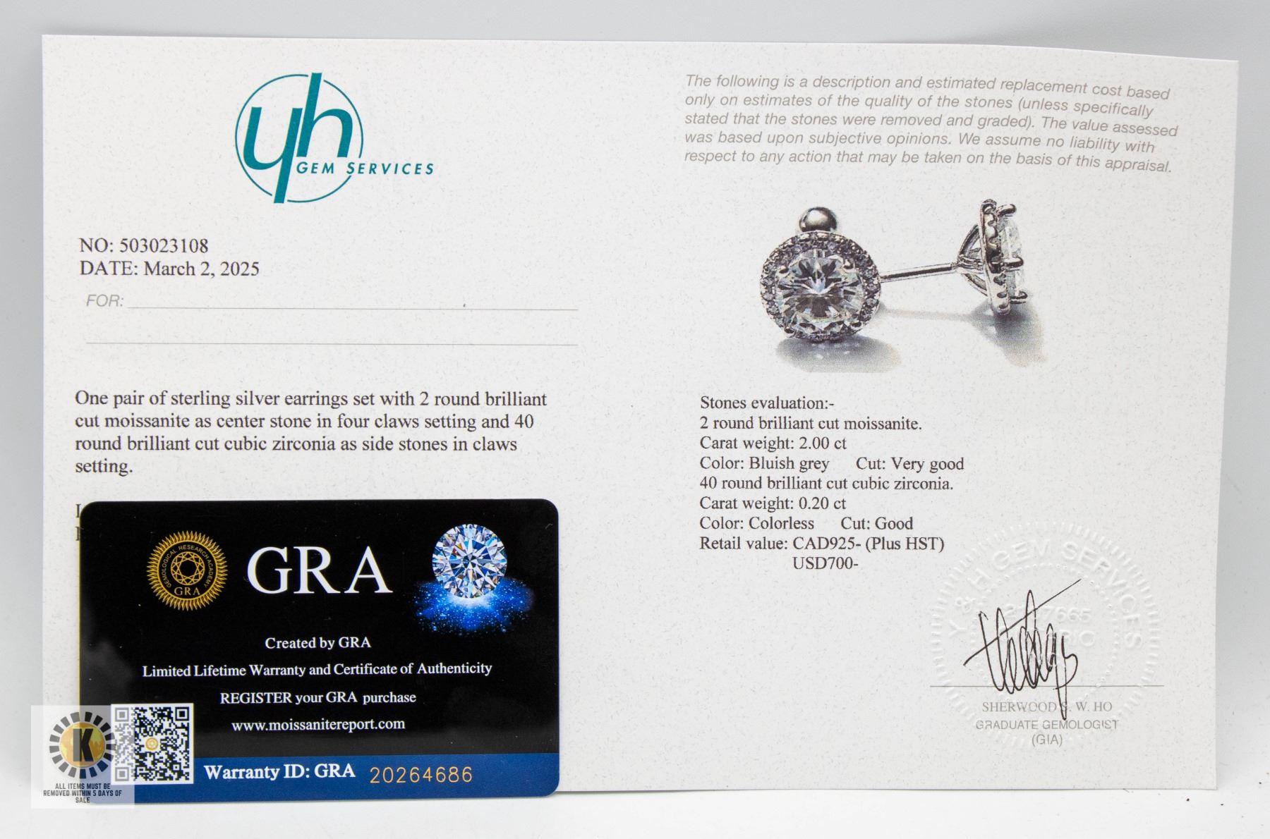 CUT MOISSANITE STONES VVS D COLOR WITH 40 ROUND BRILLIANT CUT CUBIC ZIRCONIA SET IN HALOS SET IN 925 SILVER EARRINGS WITH SCREW BACKS RETAIL VALUE $925.00 **ALL ITEMS MUST BE REMOVED BY 5PM SATURDAY, APRIL 12TH 2025. ALL REMAINING ITEMS WILL BE SUBJECT TO A $6.00 PER DAY STORAGE CHARGE. ANY ITEMS REMAINING AFTER MONDAY, APRIL 28TH 2025 WILL BE CONSIDERED FORFEITED. NO REFUNDS WILL BE ISSUED FOR FORFEITED ITEMS. TO SCHEDULE A PICK UP APPOINTMENT CLICK HERE