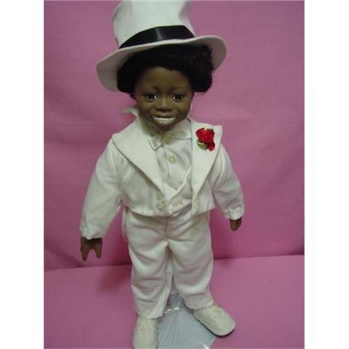 BUCKWHEAT, THE KING OF SWING, MINT IN BOX. From the Hamilton Collection, 16" porcelain head, arms, legs and cloth body Buckwheat in a beautiful white tuxedo and tophat. His face has brown eyes, rosy cheeks, and smiling mouth with teeth. He is mint in box with certificates. A nice bright and different addition to any collection!