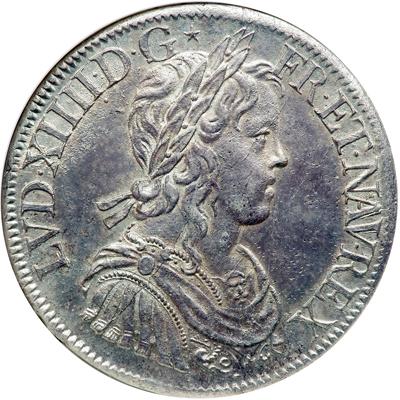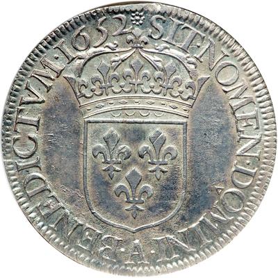 France. Ecu a la meche longue, 1652-A (Paris). Dav-3799; KM-155.1; Gad-202. Bust with long curl. Louis XIV, 1643-1715. Laureate head right. Reverse Crowned arms. NGC graded MS-61.