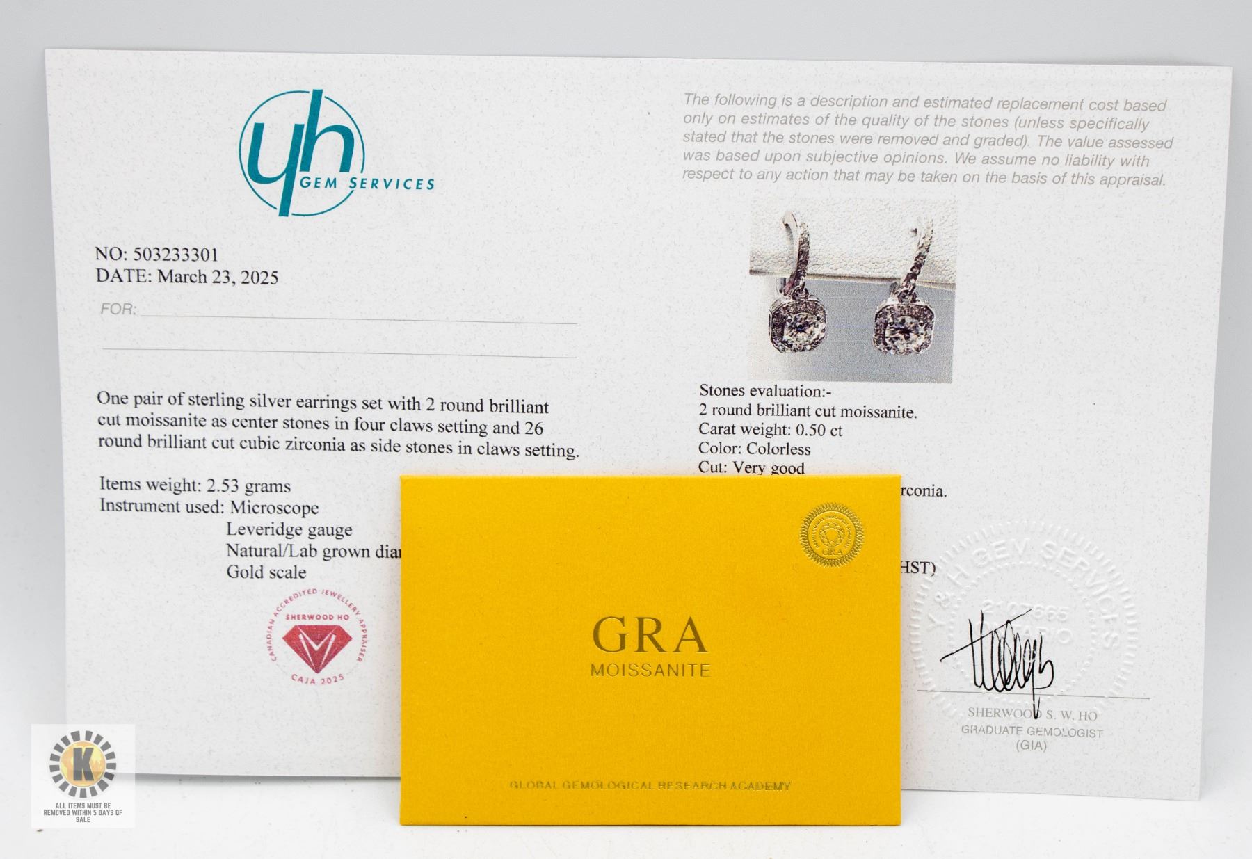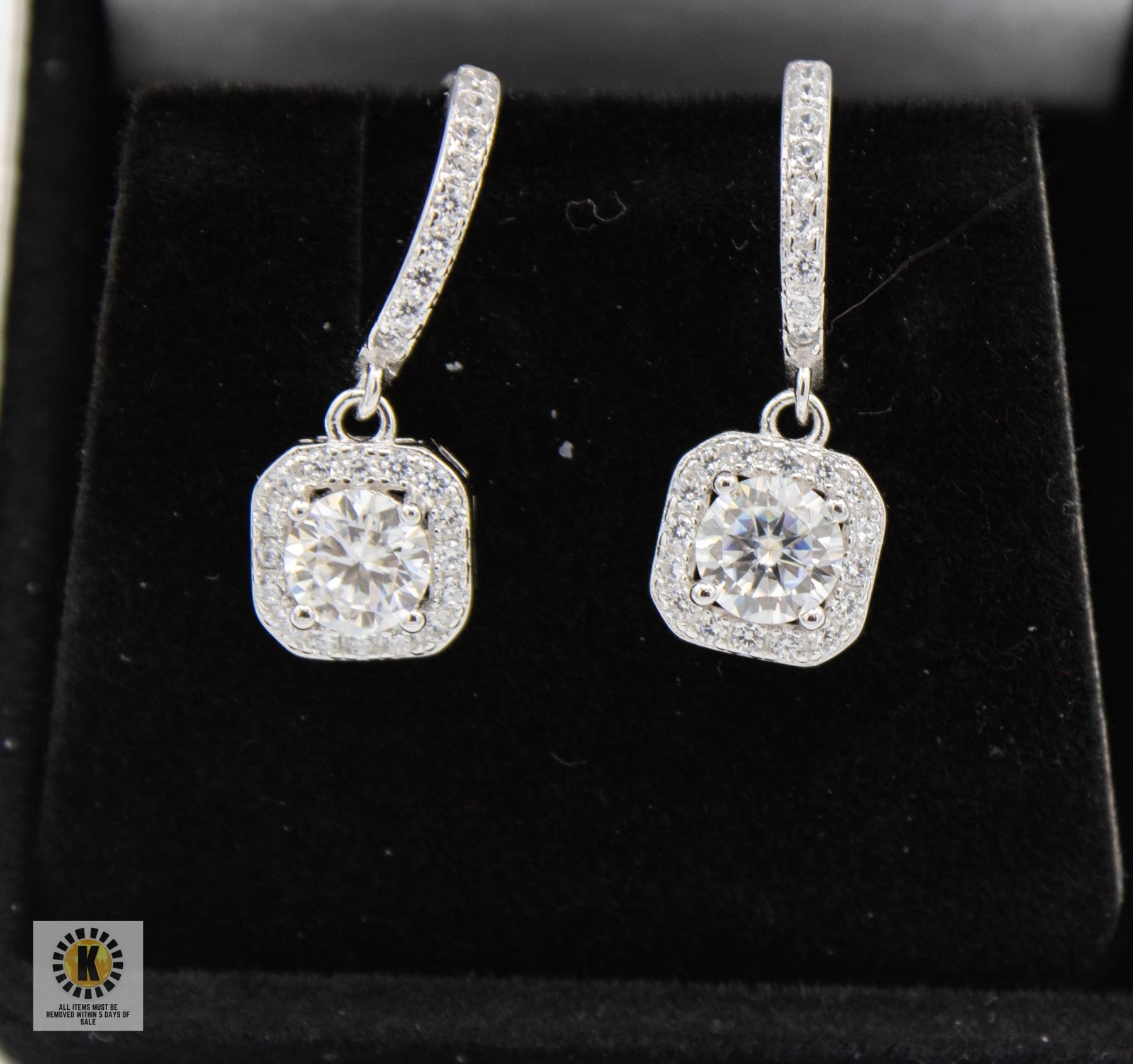 MOISSANITE STONES VVS D COLOR WITH 26 ROUND BRILLIANT CUT CUBIC ZIRCONIA SET IN SQUARE HALOS AND CLIPS SET IN 925 SILVER EARRINGS RETAIL VALUE $775.00 **ALL ITEMS MUST BE REMOVED BY 5PM SATURDAY, APRIL 5TH 2025. ALL REMAINING ITEMS WILL BE SUBJECT TO A $6.00 PER DAY STORAGE CHARGE. ANY ITEMS REMAINING AFTER MONDAY, MAY 5TH 2025 WILL BE CONSIDERED FORFEITED. NO REFUNDS WILL BE ISSUED FOR FORFEITED ITEMS. TO SCHEDULE A PICK UP APPOINTMENT CLICK HERE