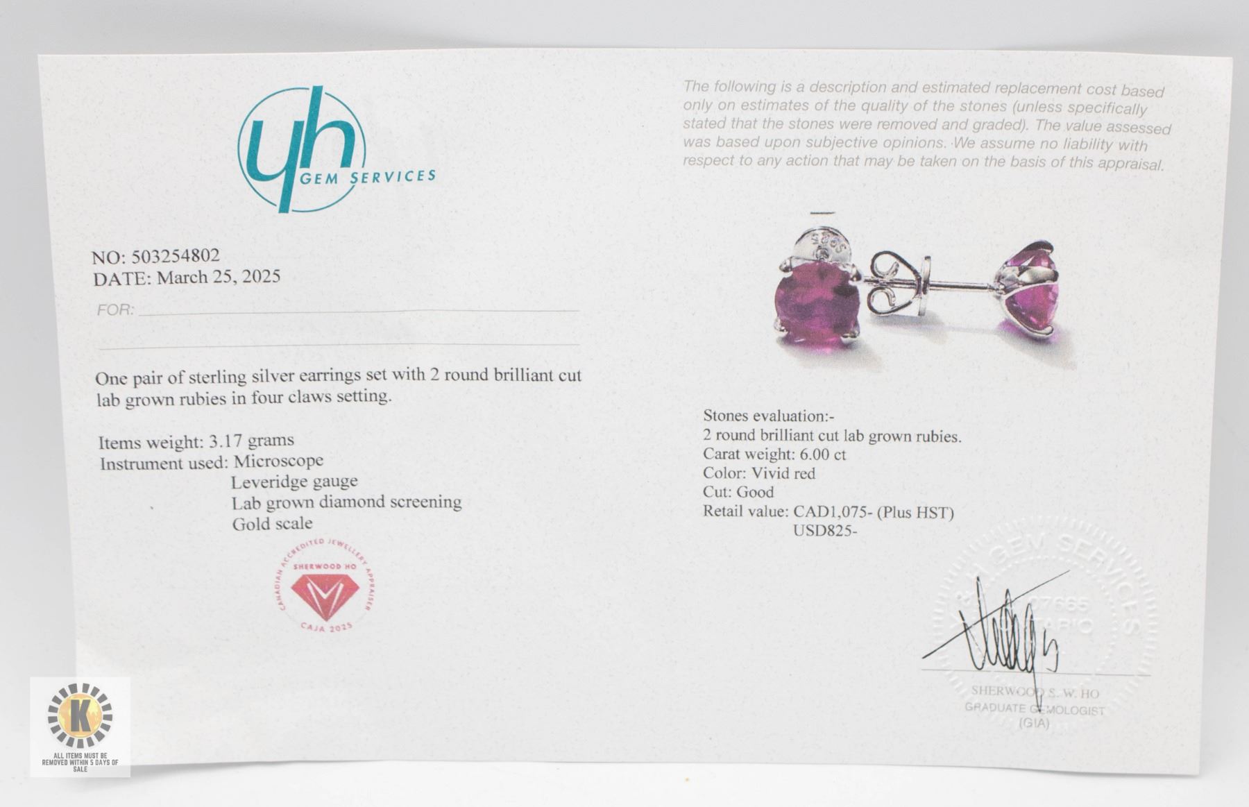 RUBIES VIVID RED COLOR SET IN 4 CLAW HEAD SET IN 925 SILVER EARRINGS RETAIL VALUE $1,075.00 **ALL ITEMS MUST BE REMOVED BY 5PM SATURDAY, APRIL 5TH 2025. ALL REMAINING ITEMS WILL BE SUBJECT TO A $6.00 PER DAY STORAGE CHARGE. ANY ITEMS REMAINING AFTER MONDAY, MAY 5TH 2025 WILL BE CONSIDERED FORFEITED. NO REFUNDS WILL BE ISSUED FOR FORFEITED ITEMS. TO SCHEDULE A PICK UP APPOINTMENT CLICK HERE