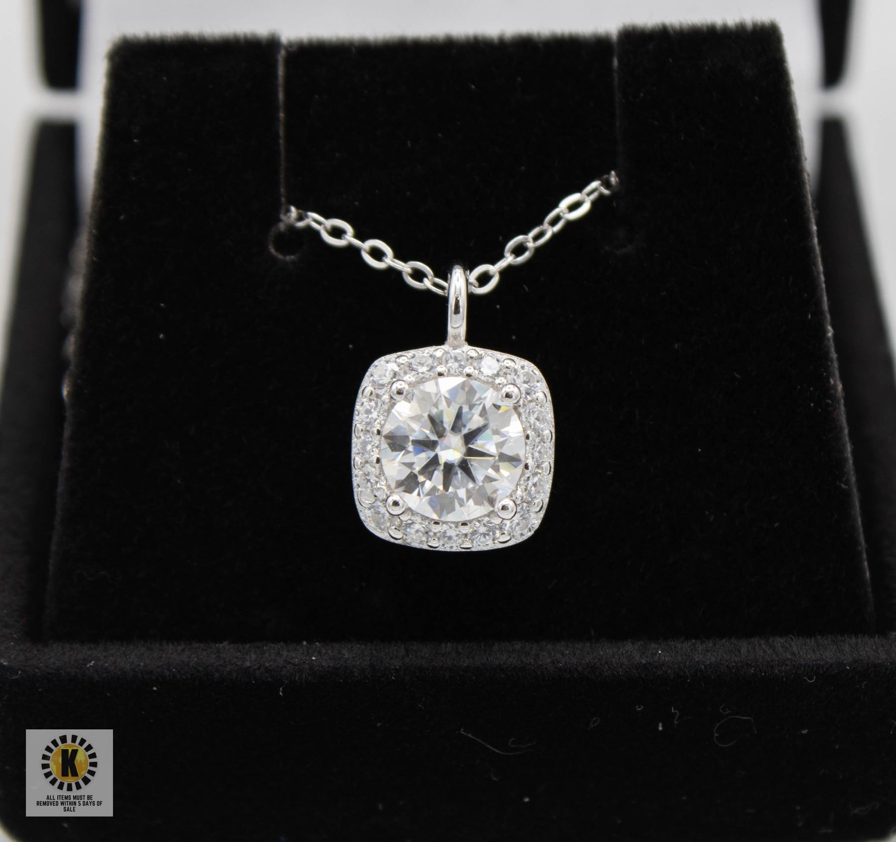 MOISSANITE STONE VVS D COLOR SET IN CENTER OF SQUARE HALO WITH 18 ROUND BRILLIANT CUT CUBIC ZIRCONIA SET IN 925 SILVER PENDANT AND NECKLACE **ALL ITEMS MUST BE REMOVED BY 5PM SATURDAY, APRIL 5TH 2025. ALL REMAINING ITEMS WILL BE SUBJECT TO A $6.00 PER DAY STORAGE CHARGE. ANY ITEMS REMAINING AFTER MONDAY, MAY 5TH 2025 WILL BE CONSIDERED FORFEITED. NO REFUNDS WILL BE ISSUED FOR FORFEITED ITEMS. TO SCHEDULE A PICK UP APPOINTMENT CLICK HERE