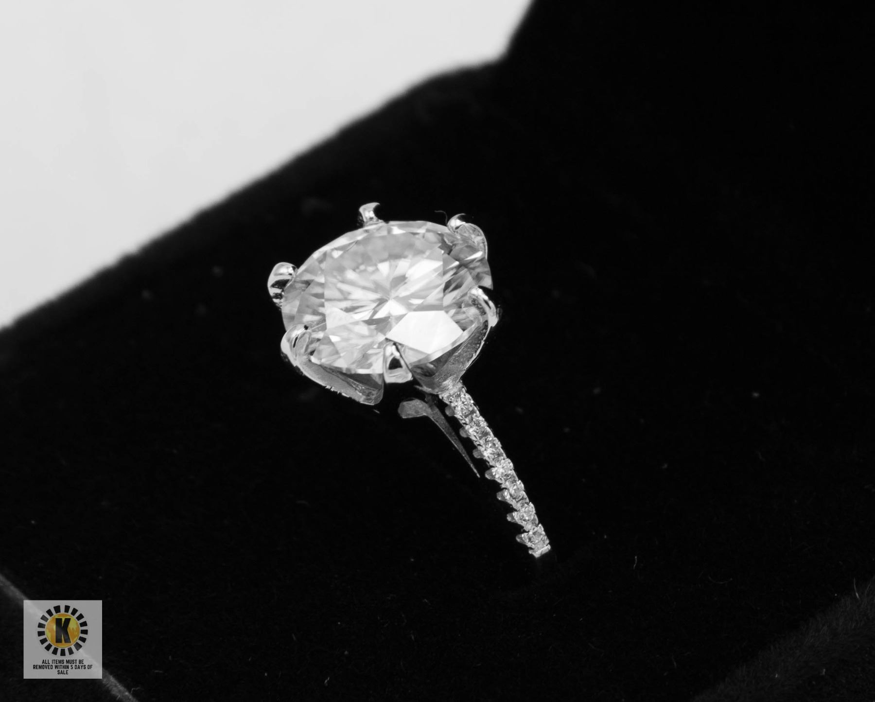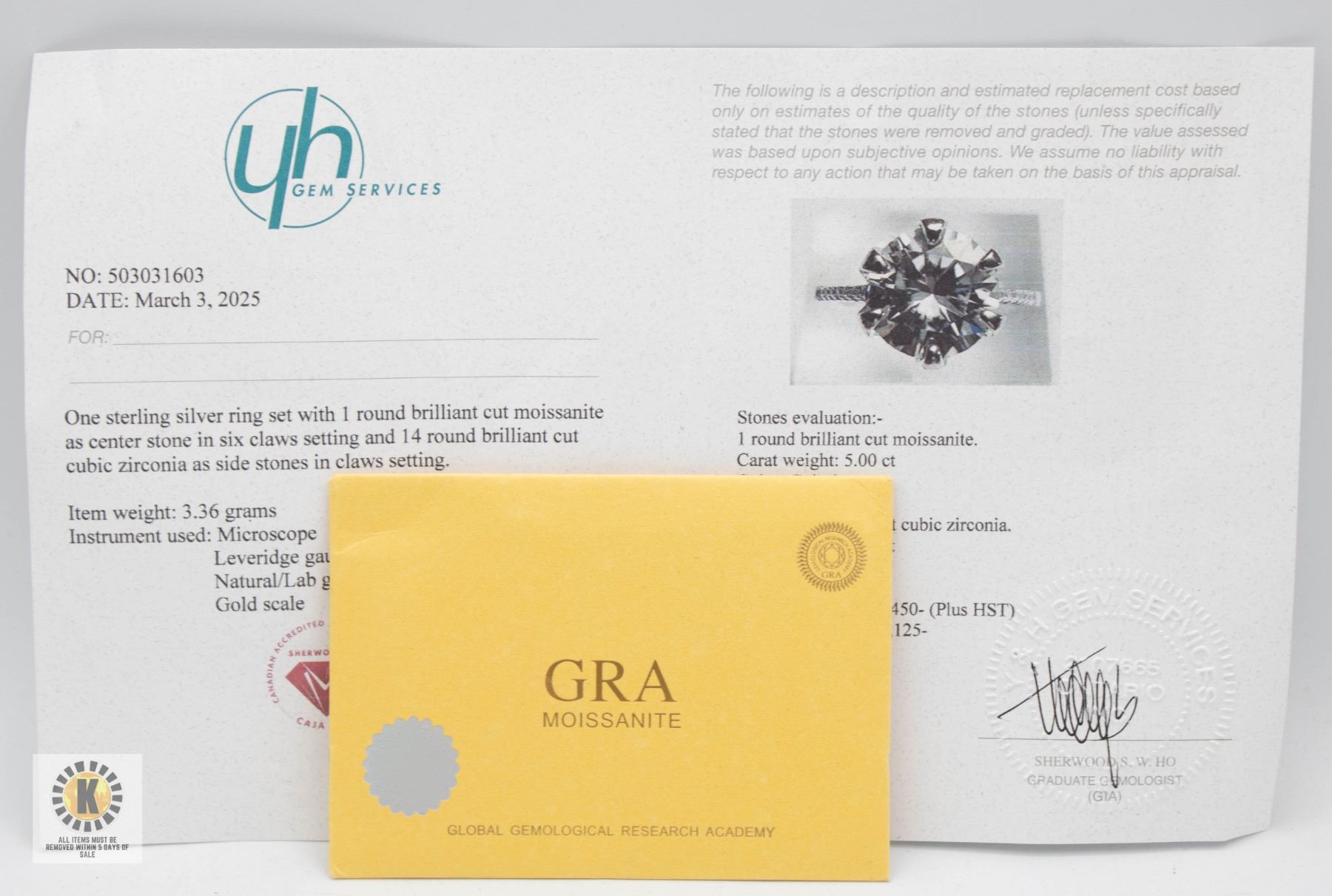 MOISSANITE STONE VVS D COLOR SET IN CENTER WITH 14 ROUND BRILLIANT CUT CUBIC ZIRCONIA AND SET IN 925 SILVER RING SIZE 7 RETAIL VALUE $1,450.00 **ALL ITEMS MUST BE REMOVED BY 5PM SATURDAY, APRIL 26TH 2025. ALL REMAINING ITEMS WILL BE SUBJECT TO A $6.00 PER DAY STORAGE CHARGE. ANY ITEMS REMAINING AFTER MONDAY, MAY 12TH 2025 WILL BE CONSIDERED FORFEITED. NO REFUNDS WILL BE ISSUED FOR FORFEITED ITEMS. TO SCHEDULE A PICK UP APPOINTMENT CLICK HERE
