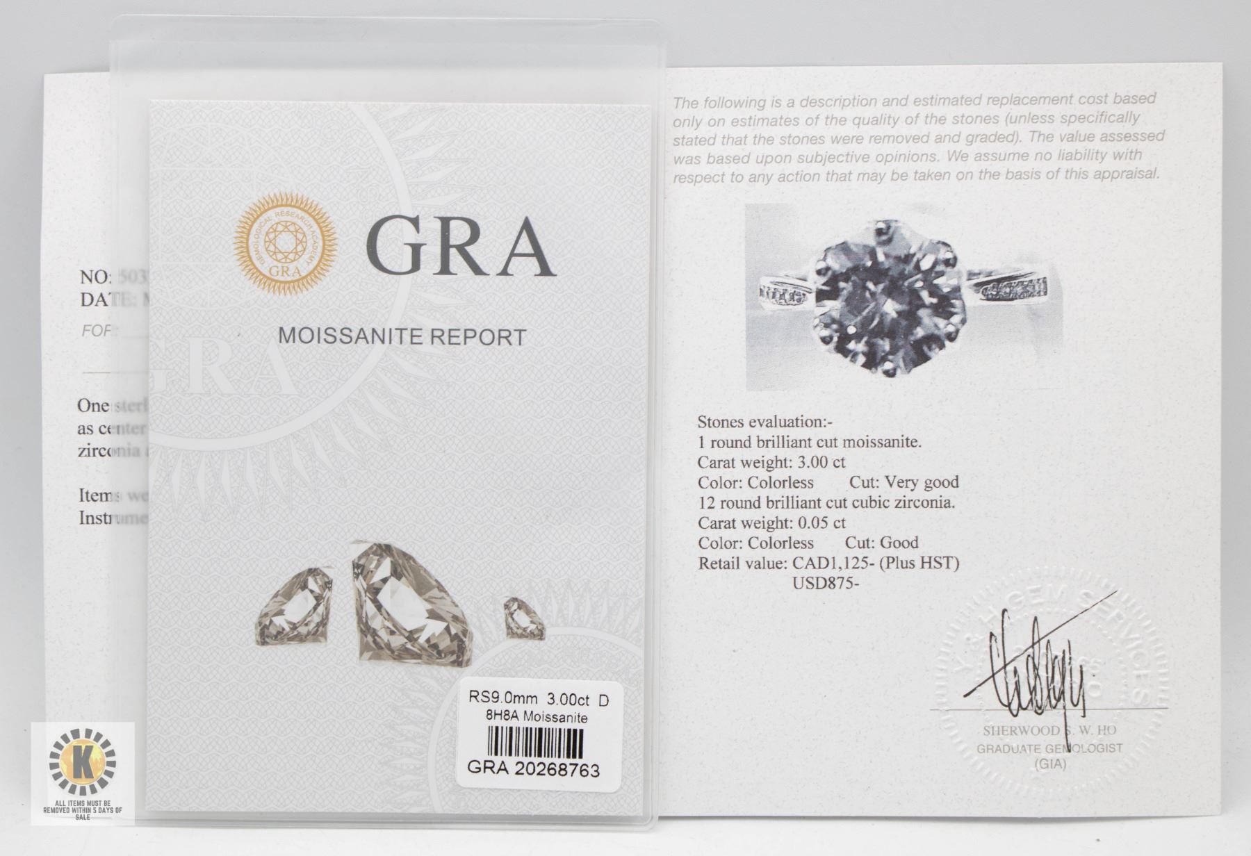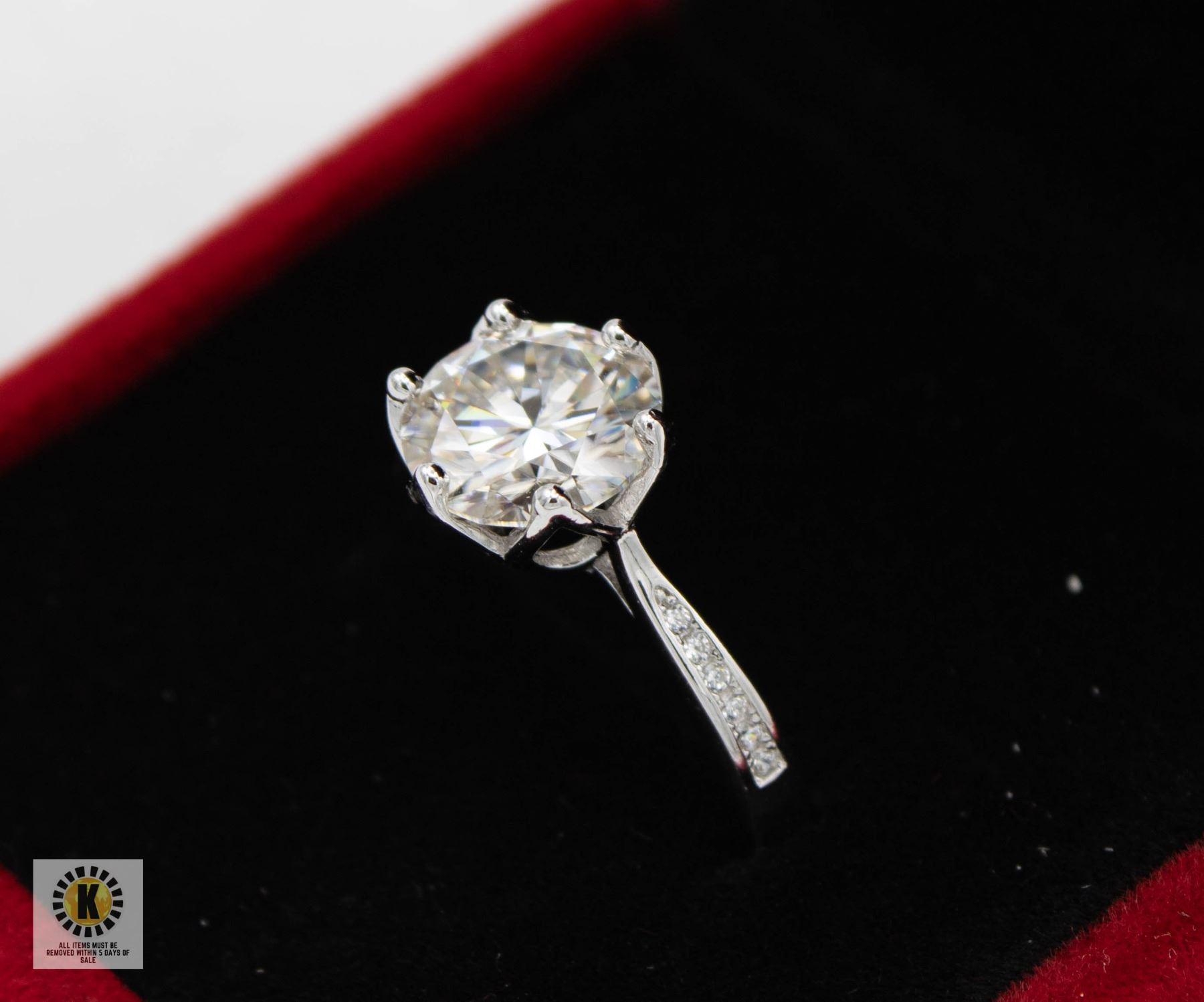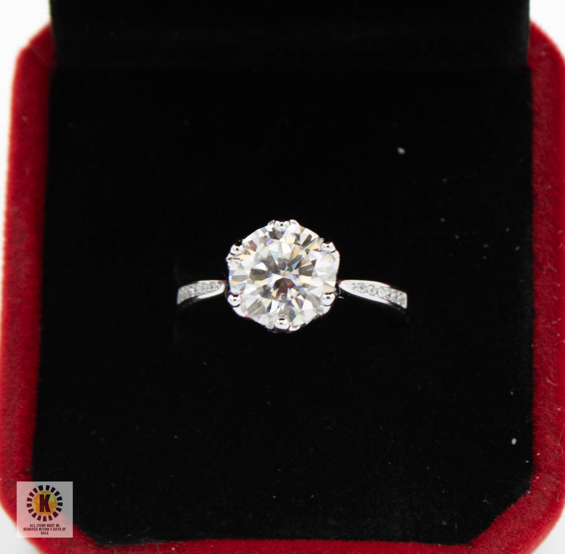 MOISSANITE STONE VVS D COLOR WITH 12 ROUND BRILLIANT CUT CUBIC ZIRCONIA SET IN THE SHANKS SET IN 925 SILVER RING SIZE 7.25 RETAIL VALUE $1,125.00 **ALL ITEMS MUST BE REMOVED BY 5PM SATURDAY, APRIL 26TH 2025. ALL REMAINING ITEMS WILL BE SUBJECT TO A $6.00 PER DAY STORAGE CHARGE. ANY ITEMS REMAINING AFTER MONDAY, MAY 12TH 2025 WILL BE CONSIDERED FORFEITED. NO REFUNDS WILL BE ISSUED FOR FORFEITED ITEMS. TO SCHEDULE A PICK UP APPOINTMENT CLICK HERE