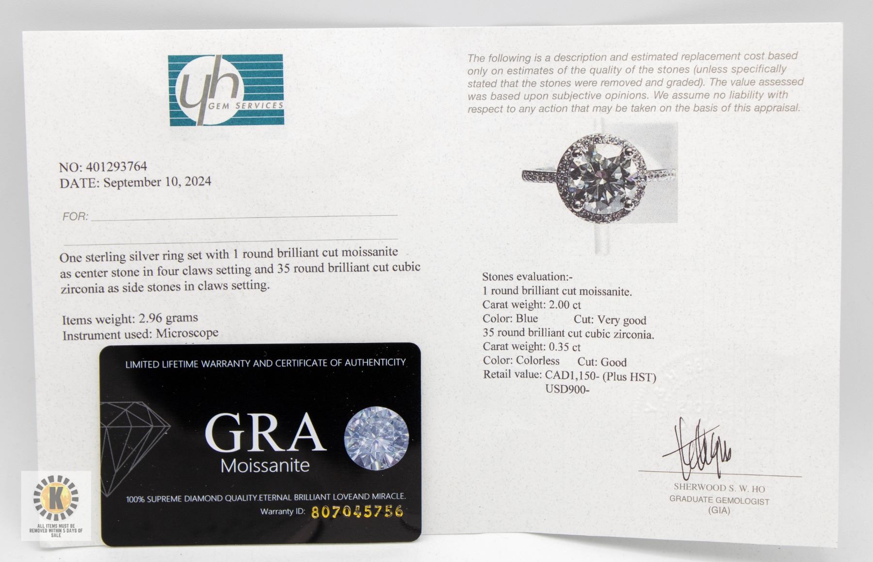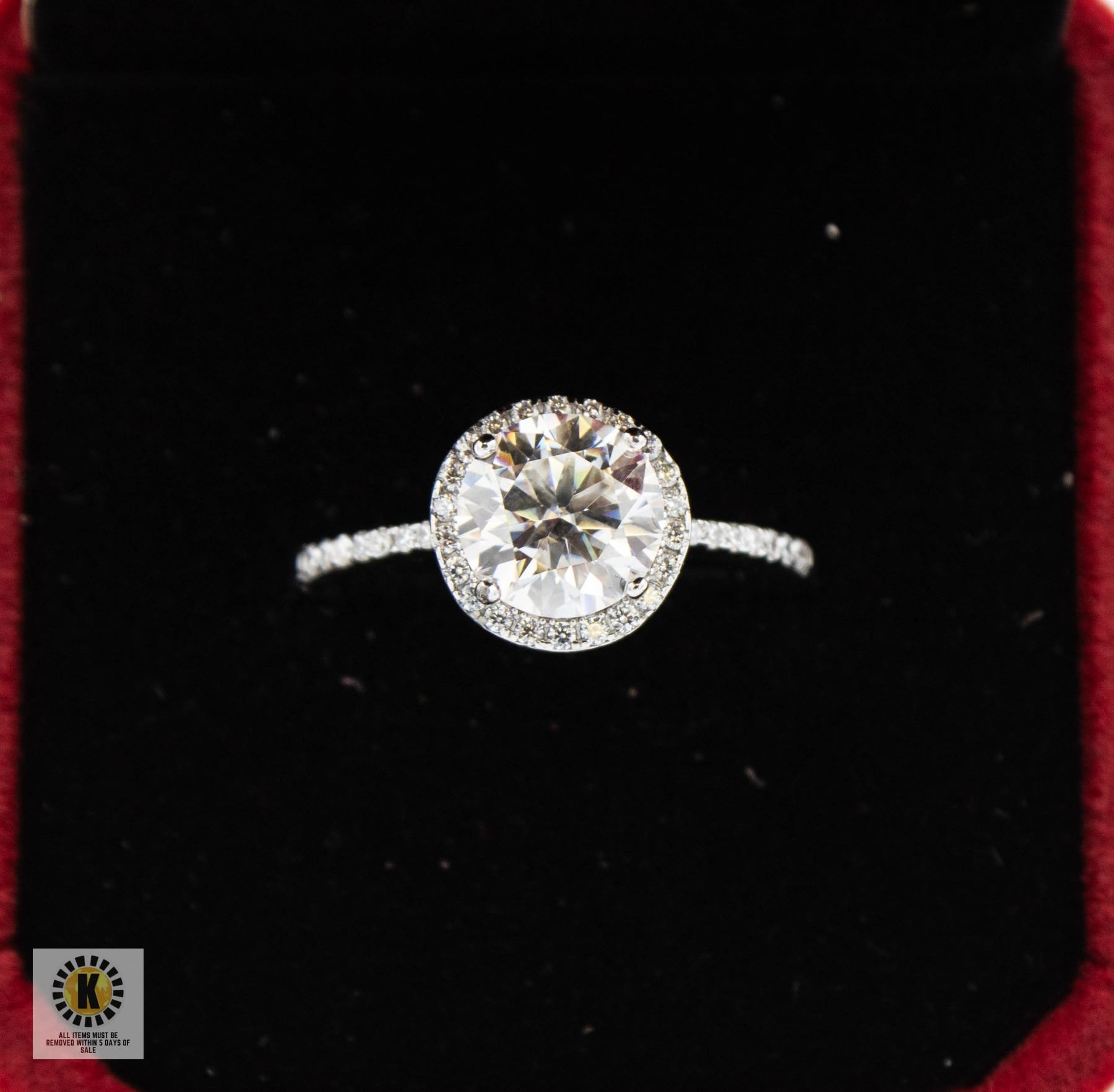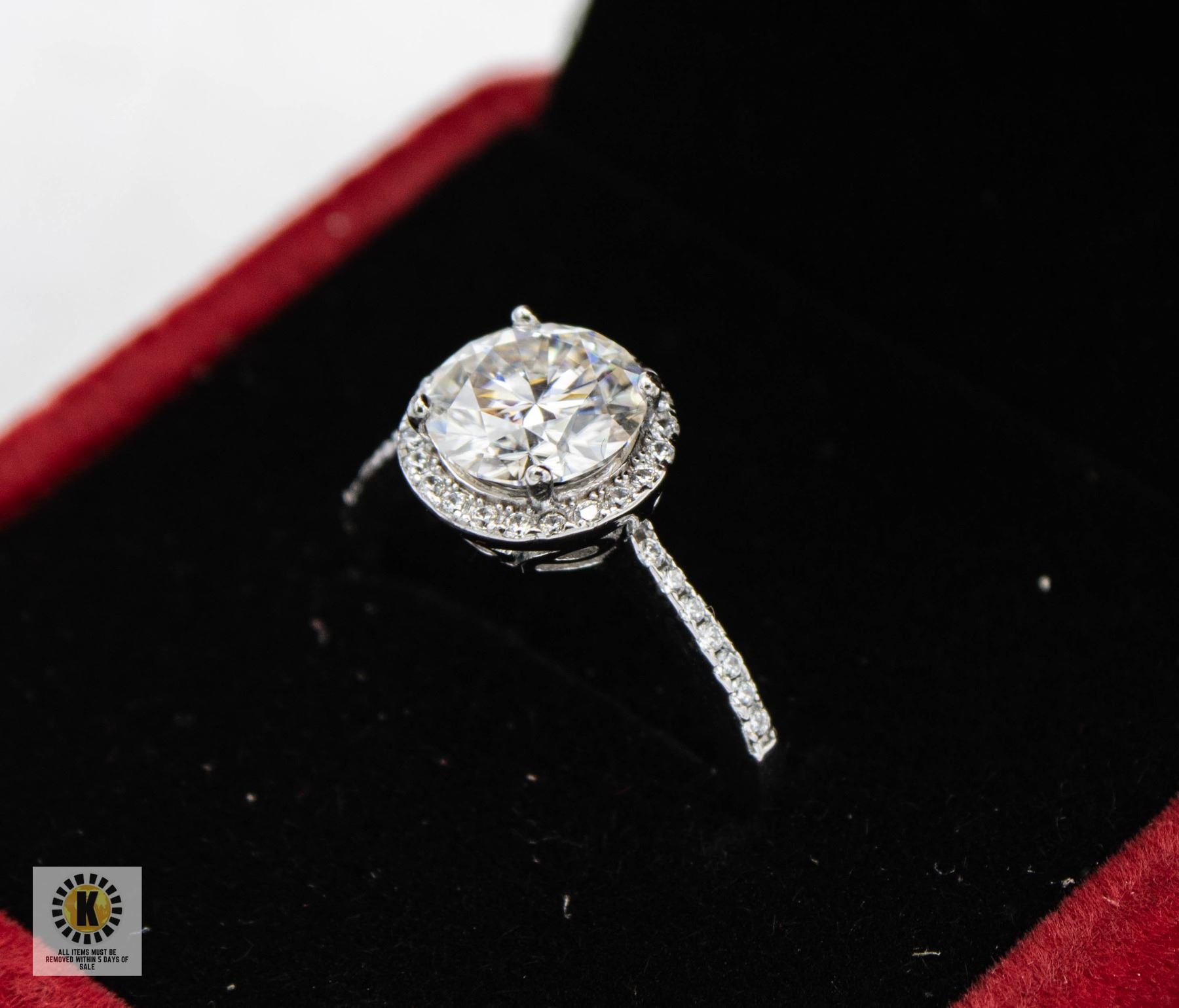 MOISSANITE STONE VVS D COLOR SET WITH 35 ROUND BRILLIANT CUT CUBIC ZIRCONIA?S SET IN ROUND SHAPED HALO SET IN 925 SILVER RING SIZE ADJUSTABLE RETAIL VALUE $1,150.00 **ALL ITEMS MUST BE REMOVED BY 5PM SATURDAY, APRIL 26TH 2025. ALL REMAINING ITEMS WILL BE SUBJECT TO A $6.00 PER DAY STORAGE CHARGE. ANY ITEMS REMAINING AFTER MONDAY, MAY 12TH 2025 WILL BE CONSIDERED FORFEITED. NO REFUNDS WILL BE ISSUED FOR FORFEITED ITEMS. TO SCHEDULE A PICK UP APPOINTMENT CLICK HERE