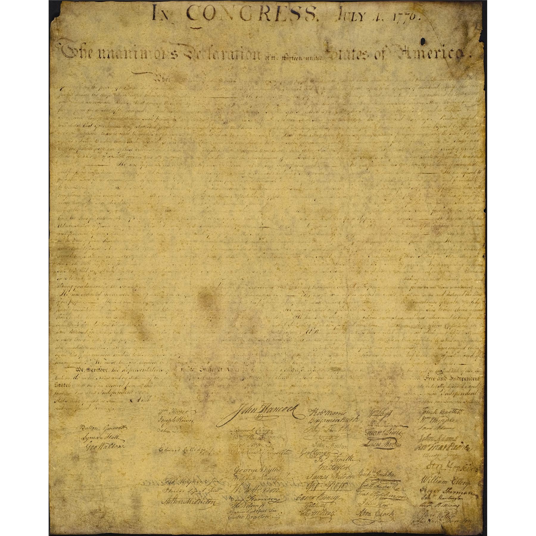 This paper document headlined "In Congress July 4 1776" features old English text printed in black ink printed to appear handwritten. The document is aged by production with brown stains, holes, and minor jagged edges. Dimensions 22" x 29" (56 cm x 73.75 cm)