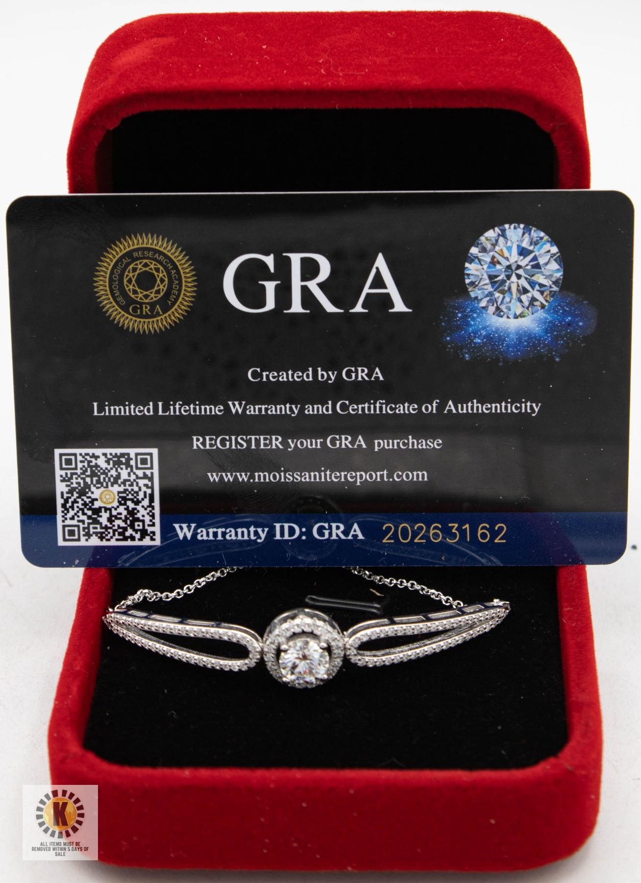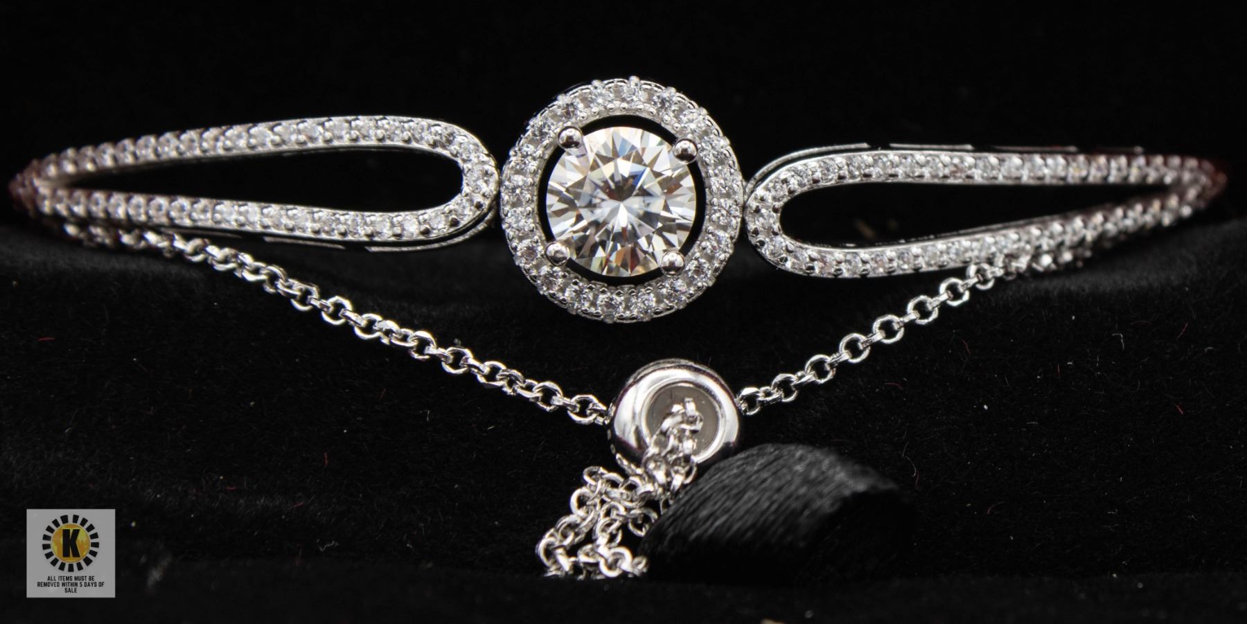 MOISSANITE STONE VVS D COLOR WITH 22 ROUND BRILLIANT CUT CUBIC ZIRCONIA SET IN ROUND HALO WITH 90 SET IN ARMS SET IN 925 SILVER BRACELET **ALL ITEMS MUST BE REMOVED BY 5PM SATURDAY, APRIL 26TH 2025. ALL REMAINING ITEMS WILL BE SUBJECT TO A $6.00 PER DAY STORAGE CHARGE. ANY ITEMS REMAINING AFTER MONDAY, MAY 12TH 2025 WILL BE CONSIDERED FORFEITED. NO REFUNDS WILL BE ISSUED FOR FORFEITED ITEMS. TO SCHEDULE A PICK UP APPOINTMENT CLICK HERE
