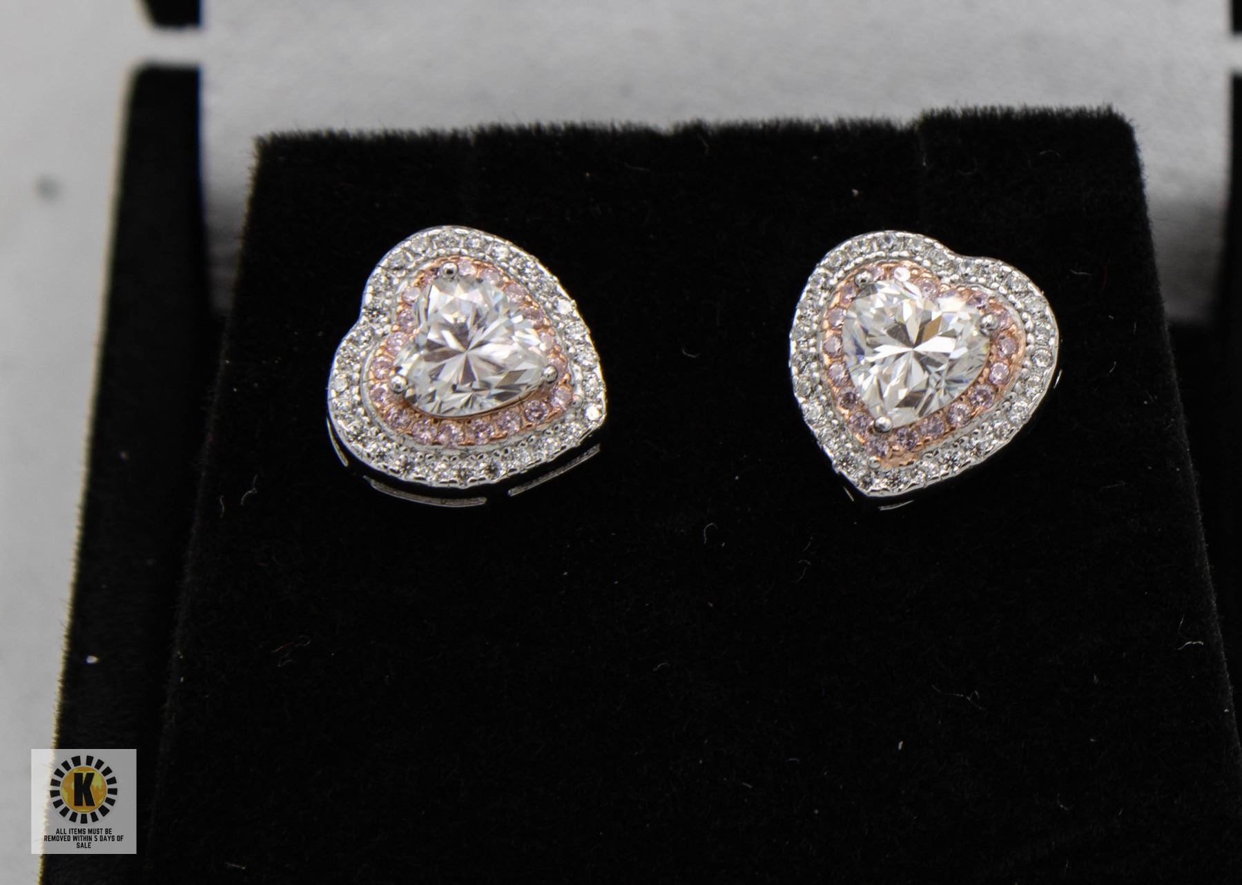 MOISSANITE STONES VVS D COLOR WITH 22 ROUND BRILLIANT CUT CUBIC ZIRCONIA SET IN HEART SHAPED HALO WITH 30 MORE IN OUTER HEART SHAPED HALO SET IN 925 SILVER EARRINGS **ALL ITEMS MUST BE REMOVED BY 5PM SATURDAY, APRIL 26TH 2025. ALL REMAINING ITEMS WILL BE SUBJECT TO A $6.00 PER DAY STORAGE CHARGE. ANY ITEMS REMAINING AFTER MONDAY, MAY 12TH 2025 WILL BE CONSIDERED FORFEITED. NO REFUNDS WILL BE ISSUED FOR FORFEITED ITEMS. TO SCHEDULE A PICK UP APPOINTMENT CLICK HERE