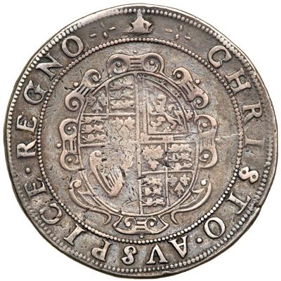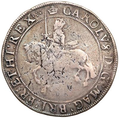 Great Britain. Crown, ND. S.2758; Dav-3764. Charles I, 1625-1649. Tower mint under the King. Mint mark, Crown (1635-6). Group III. Crowned king on horseback, sword upright facing left. Reverse Oval shield. Striking stress marks on both sides. NGC graded VG-10.