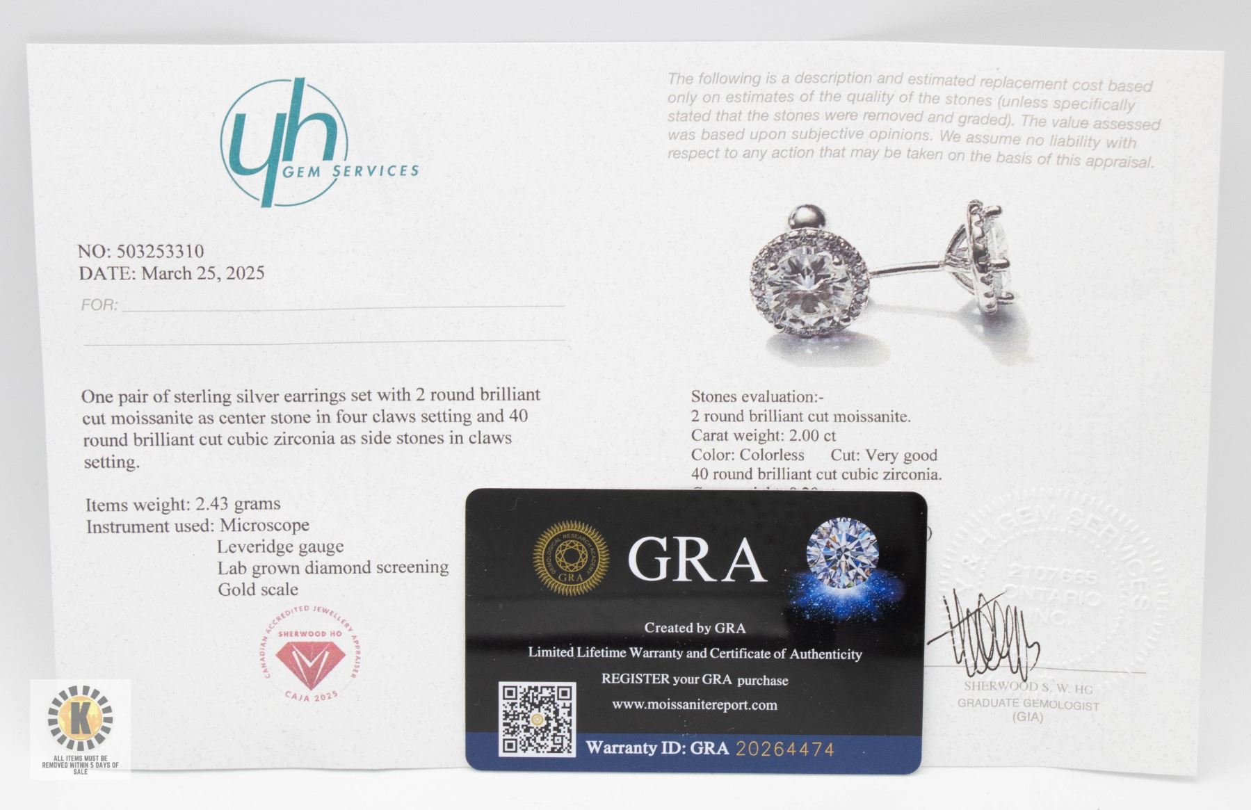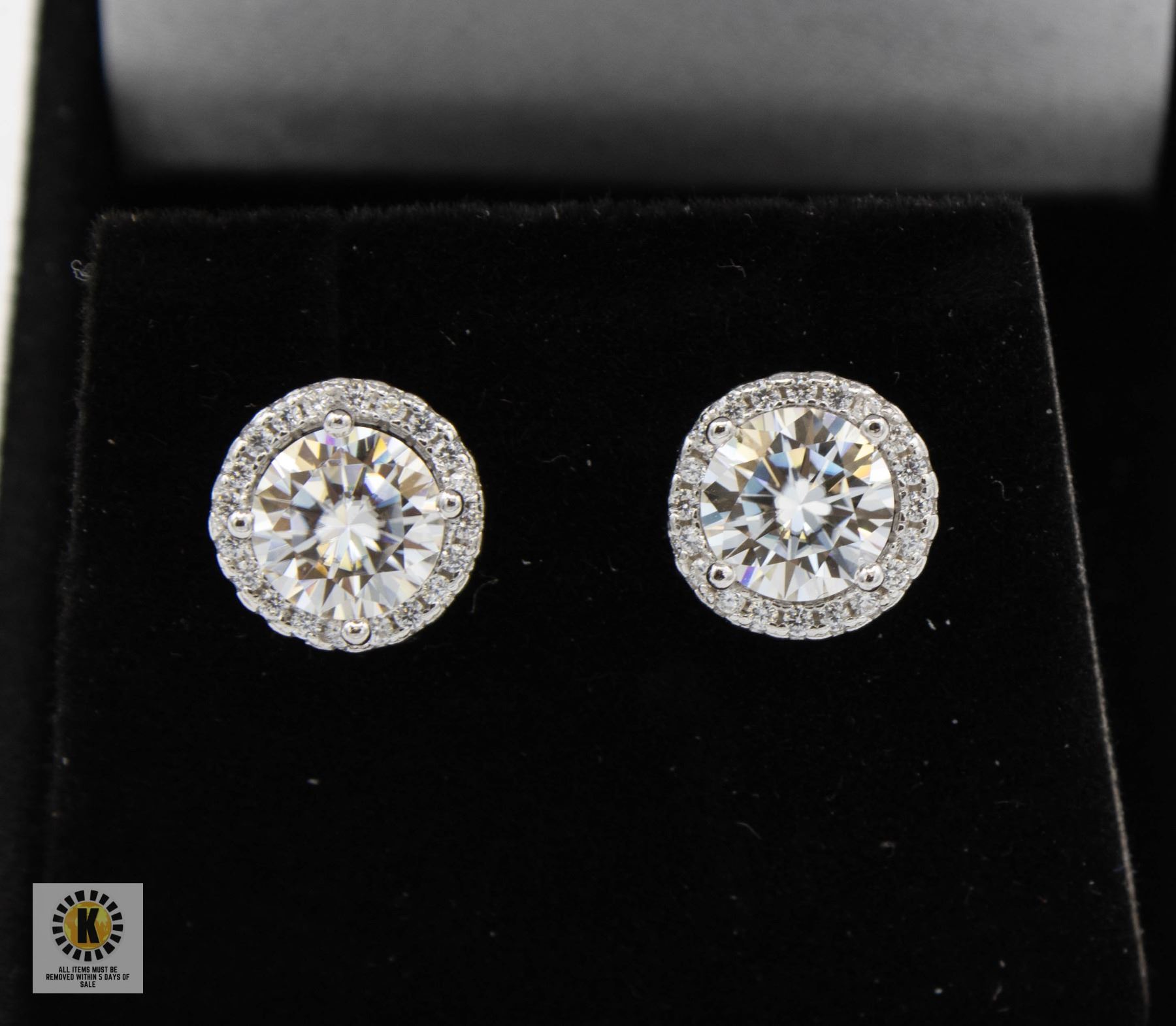 MOISSANITE STONES VVS D COLOR WITH 40 ROUND BRILLIANT CUT CUBIC ZIRCONIA SET IN ROUND HALOS SET IN 925 SILVER EARRINGS WITH SCREW BACKS RETAIL VALUE $925.00 **ALL ITEMS MUST BE REMOVED BY 5PM SATURDAY, APRIL 26TH 2025. ALL REMAINING ITEMS WILL BE SUBJECT TO A $6.00 PER DAY STORAGE CHARGE. ANY ITEMS REMAINING AFTER MONDAY, MAY 12TH 2025 WILL BE CONSIDERED FORFEITED. NO REFUNDS WILL BE ISSUED FOR FORFEITED ITEMS. TO SCHEDULE A PICK UP APPOINTMENT CLICK HERE