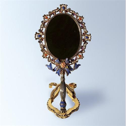 24K GOLD SWAROVSKI CRYSTAL MIRROR ON STAND IS TRIMMED WITH VINTAGE STYLE FLOWERS AND BOWS! A CLASSIC BEAUTY. D-1058