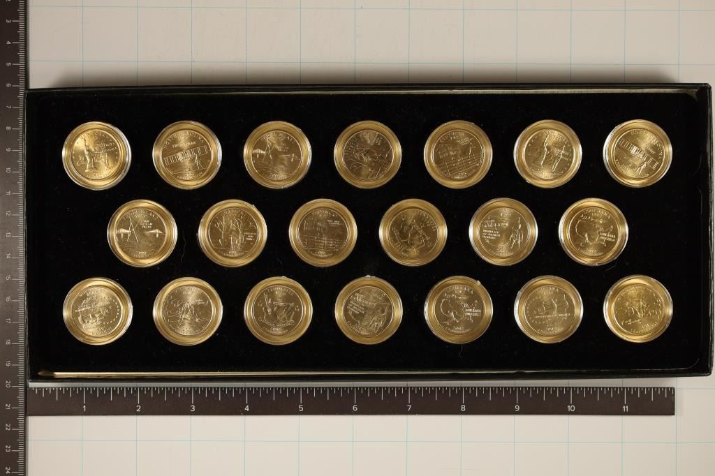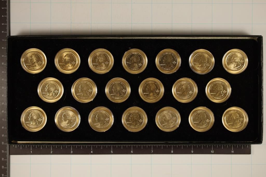 STATE QUARTERS. 20 QUARTERS IN HARD PLASTIC CAPSULES AND BOX.