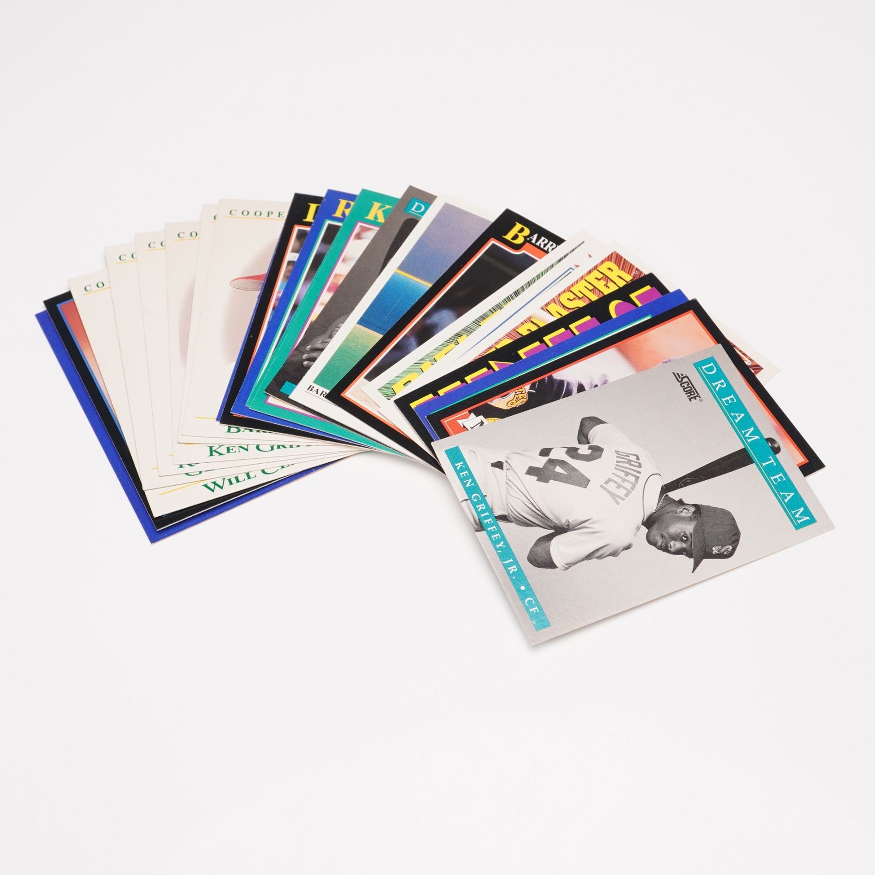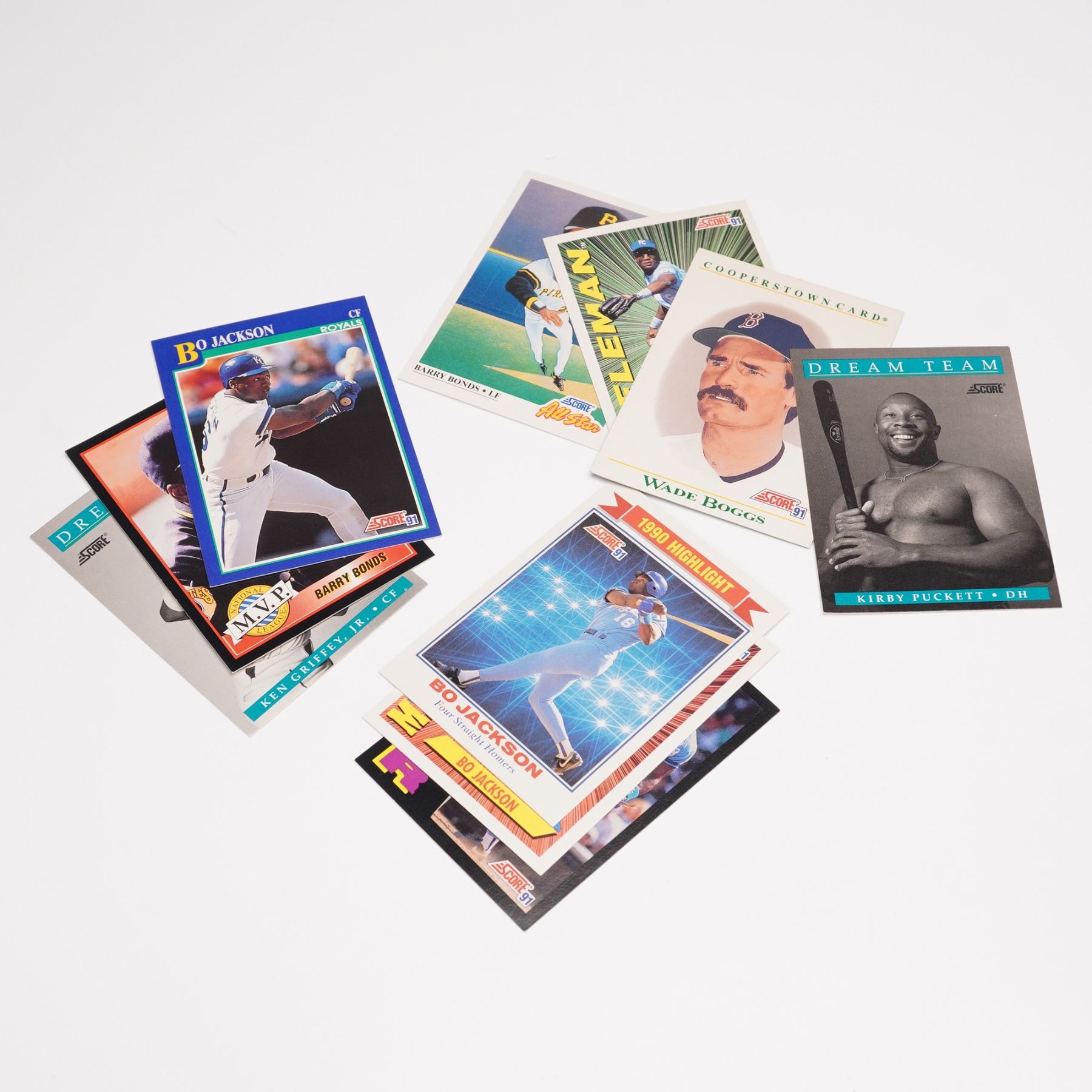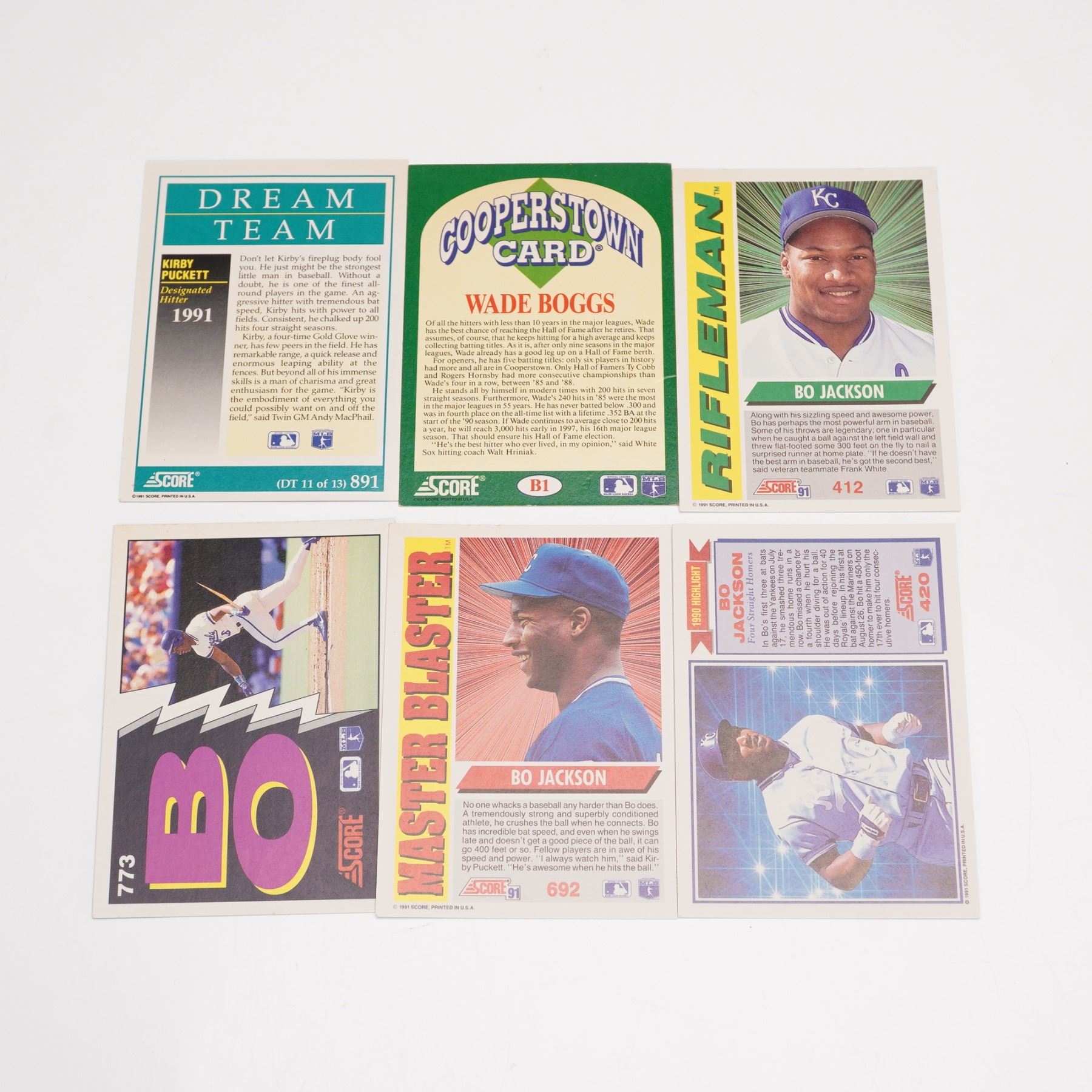 An assemblage of twenty-four baseball trading cards issued by Score in 1991, comprising an array of celebrated figures including Bo Jackson in several thematic issues such as Rifleman, Master Blaster, and 1990 Highlight, alongside cards of Barry Bonds, Wade Boggs, Kirby Puckett, and Ken Griffey Jr. The grouping features subsets such as Cooperstown tributes and Dream Team editions, each embellished with striking photographic or stylized imagery and reverse-side career highlights, statistical summaries, and biographical details.