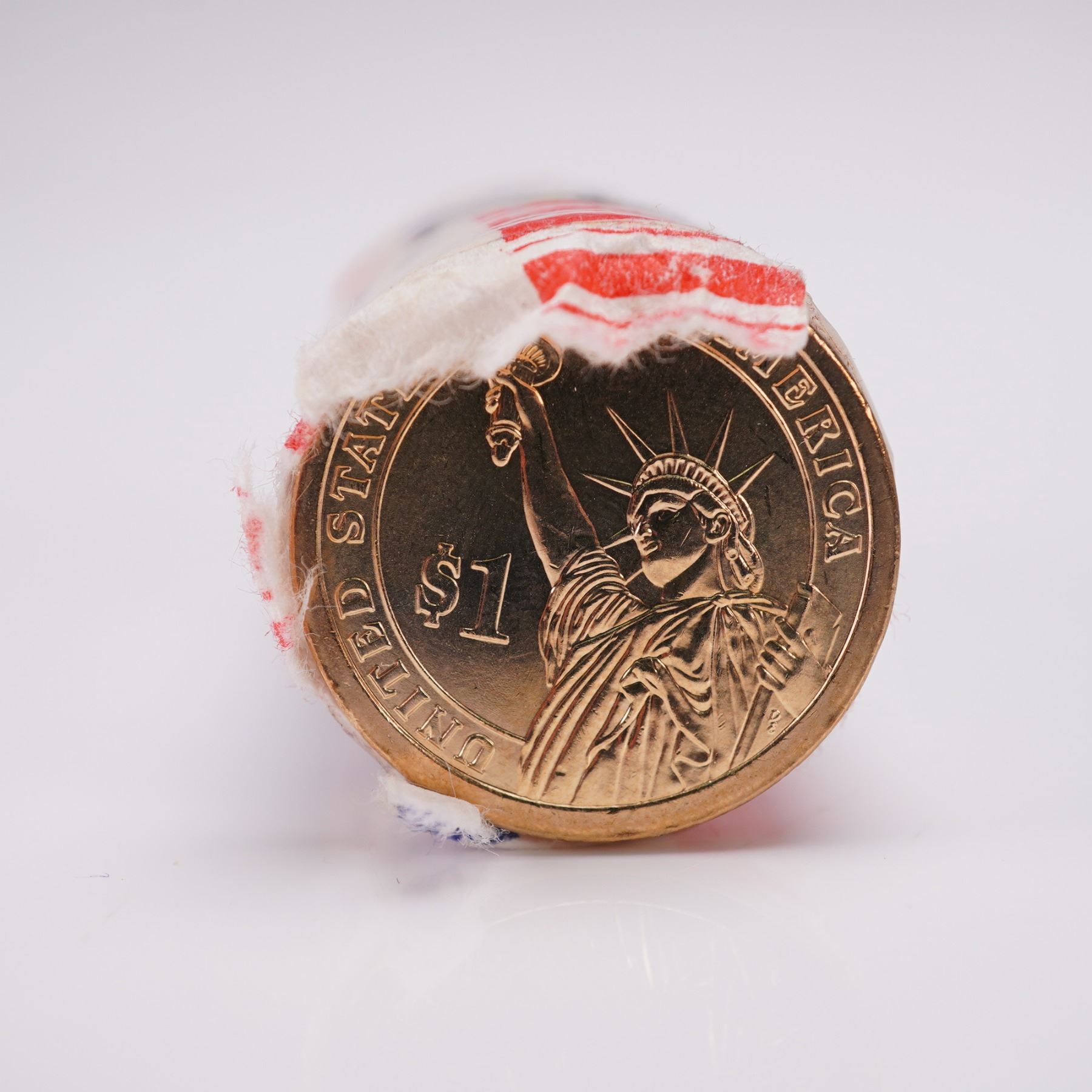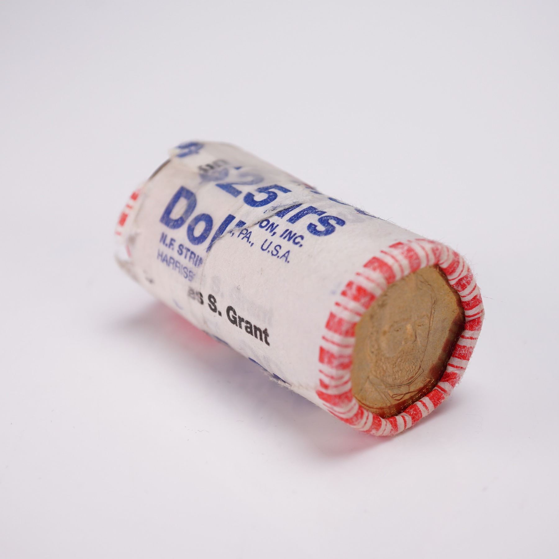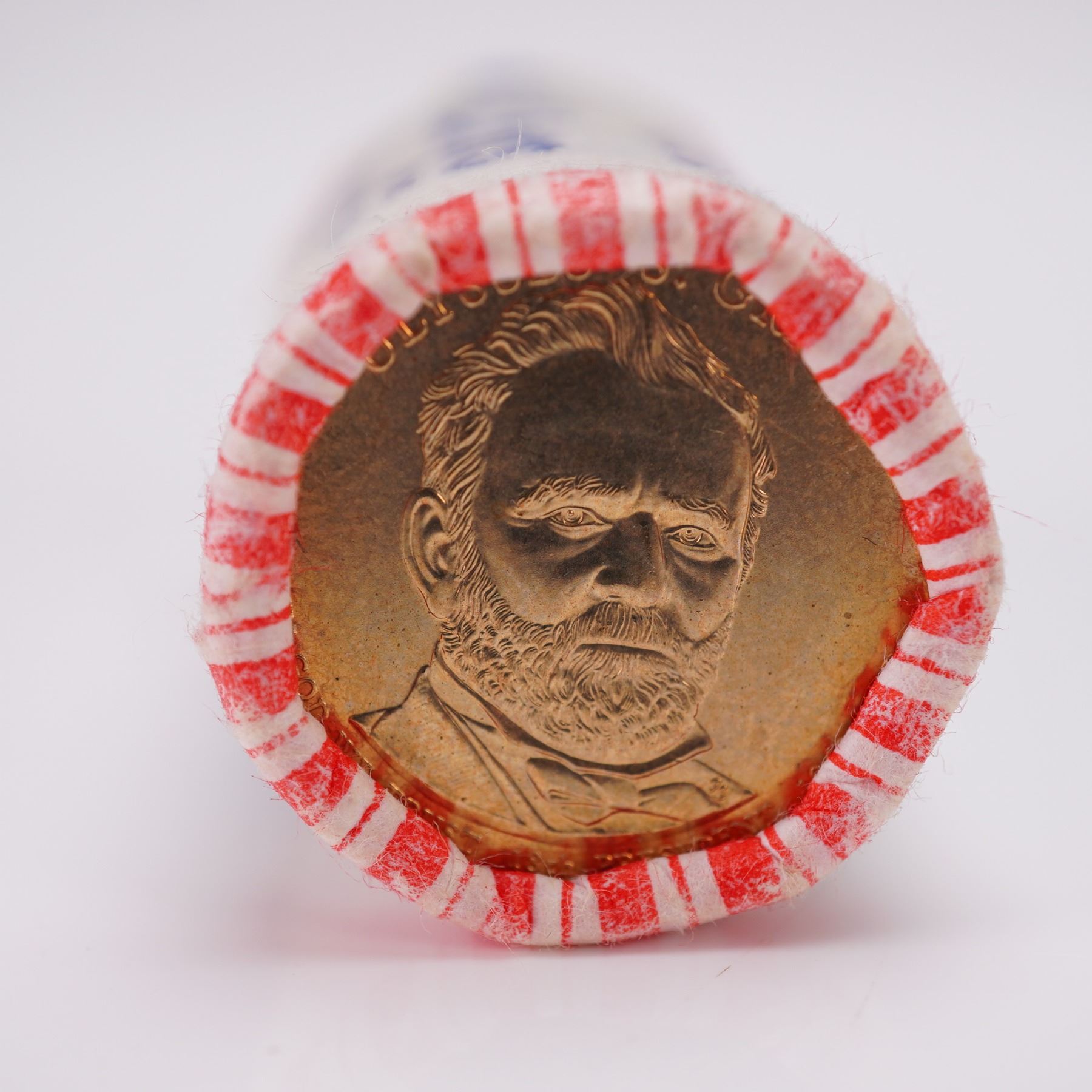These coins are struck in manganese brass clad copper, with each coin weighing approximately 8.1 grams. The roll remains unopened in its original paper wrap, marked with denomination and issuer information. The obverse features a forward-facing bust of Ulysses S. Grant, the 18th President of the United States. The design includes the President's name and term of office inscribed around the top rim. The reverse of each coin depicts the Statue of Liberty holding a torch in her raised right hand and a tablet in her left. The denomination $1 is shown to the left of the statue. Encircling the edge is the legend UNITED STATES OF AMERICA. The engraver's initials are inscribed on the book held by the statue. The coins were minted at the Philadelphia Mint, indicated by the "P" mintmark on the edge. These $1 coins are part of the United States Mint's Presidential $1 Coin Program, honoring former U.S. Presidents with a unique design for each. The roll is a standard red-and-white bank-style crimped paper and has been opened or searched. The visible end coins are identifiable as Ulysses S. Grant issues, consistent with the printed labeling on the wrapper. Coin diameter: 26.5mm. Coin roll: 2"L x 1"W.