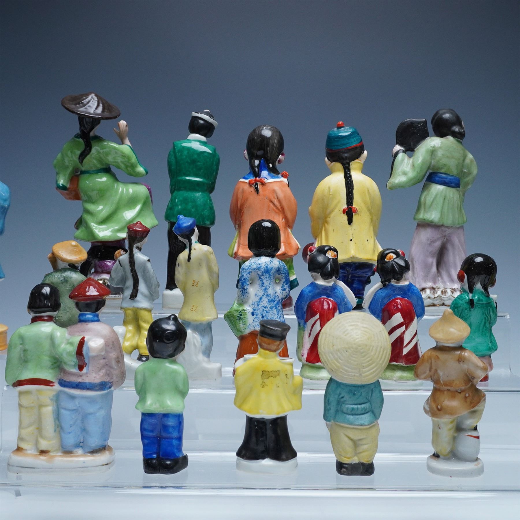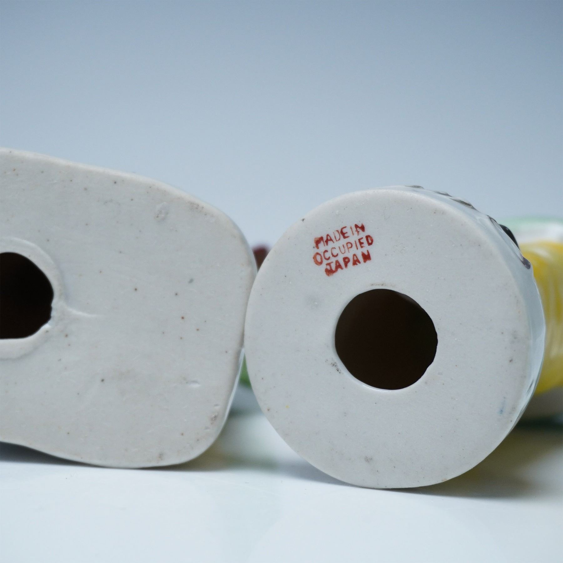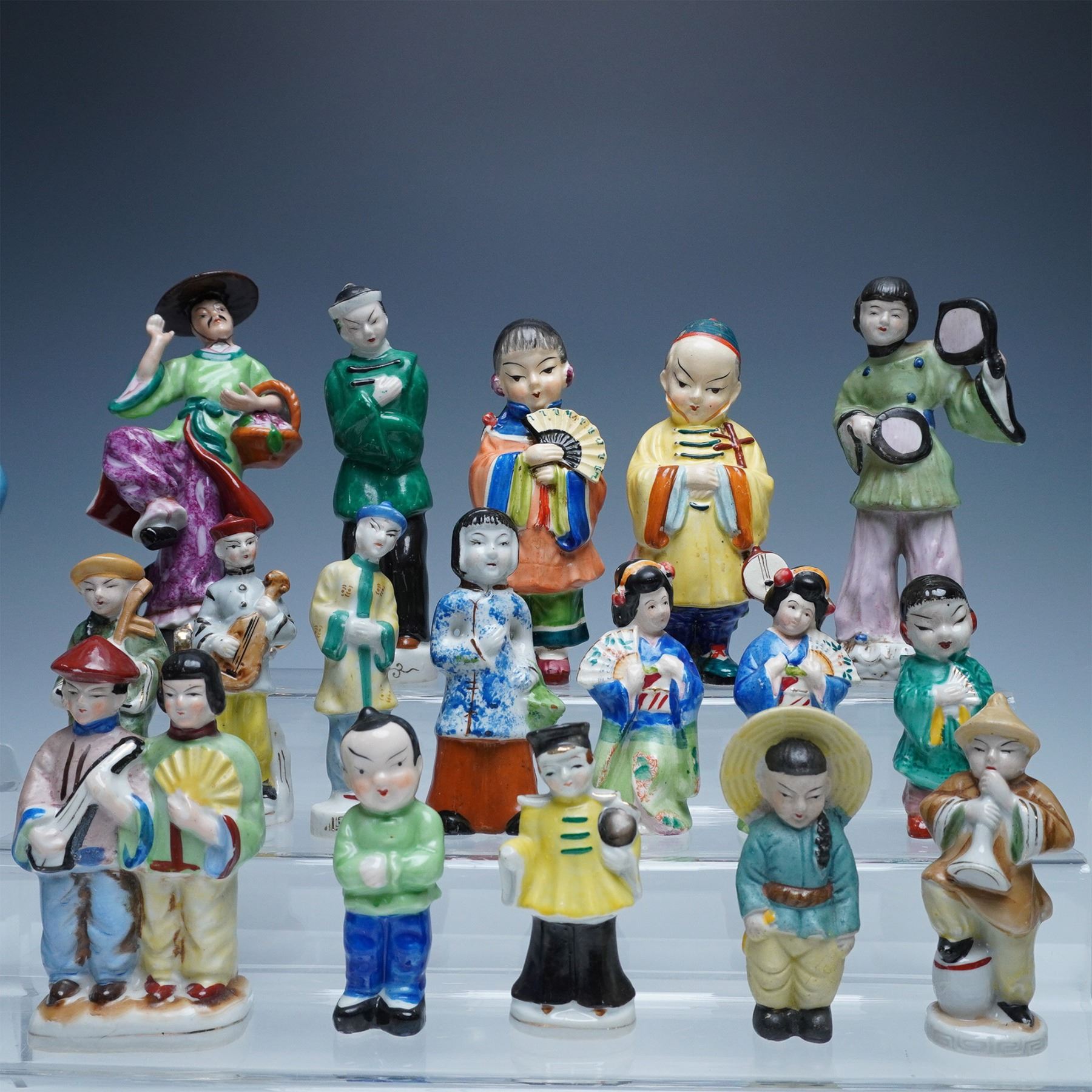 An extensive collection of hand-painted porcelain figurines, all marked "Made in Occupied Japan," dating from the post-World War II era (1945-1952). This vibrant set features a variety of figures dressed in traditional and cultural attire, including musicians, dancers, and children in expressive poses. Each figurine showcases fine detailing, intricate patterns, and bold color palettes characteristic of Japanese export porcelain from this period. These highly collectible pieces reflect the craftsmanship and artistry of the Occupied Japan era, making them an excellent addition to any vintage figurine collection. Figurines range in size from 4.25" to 8"H.