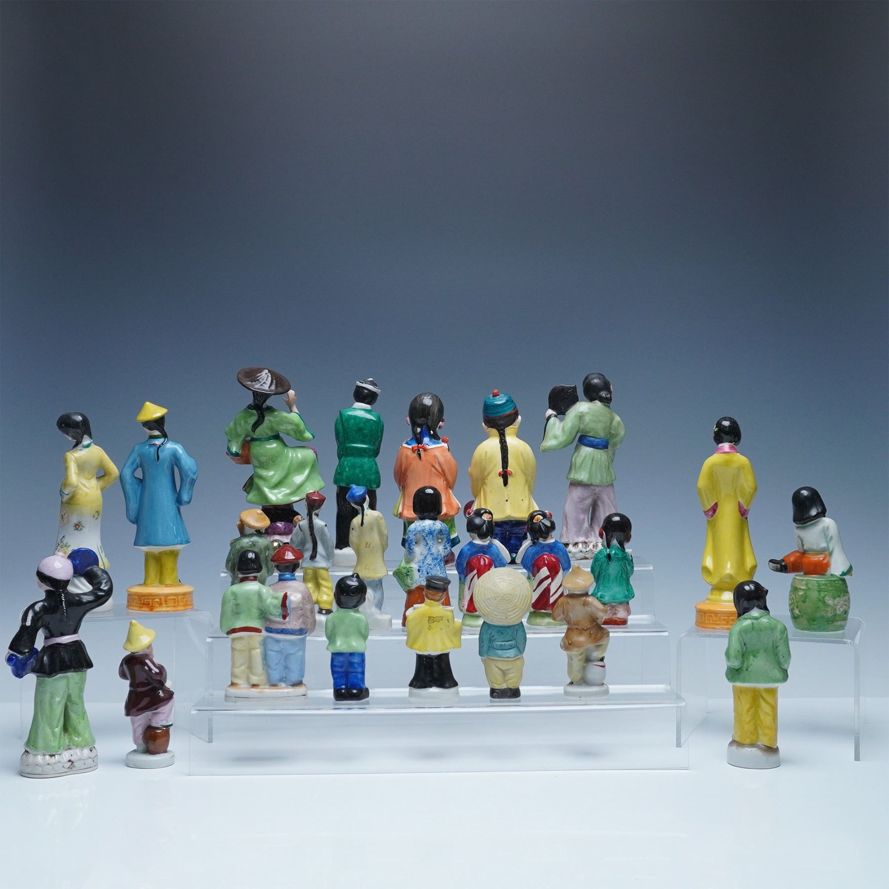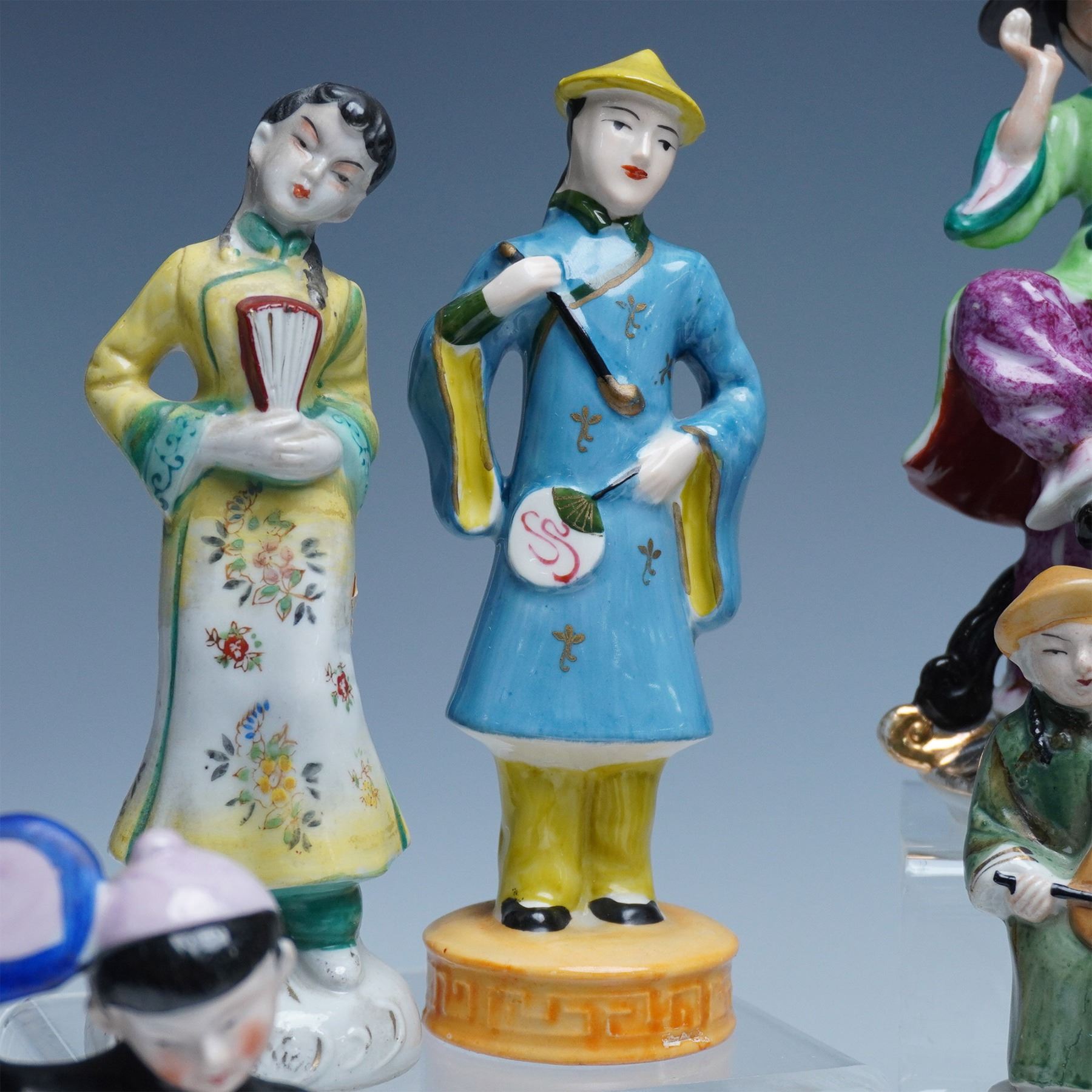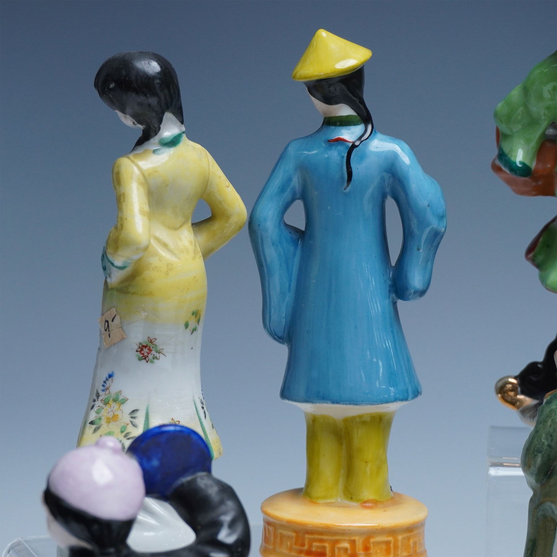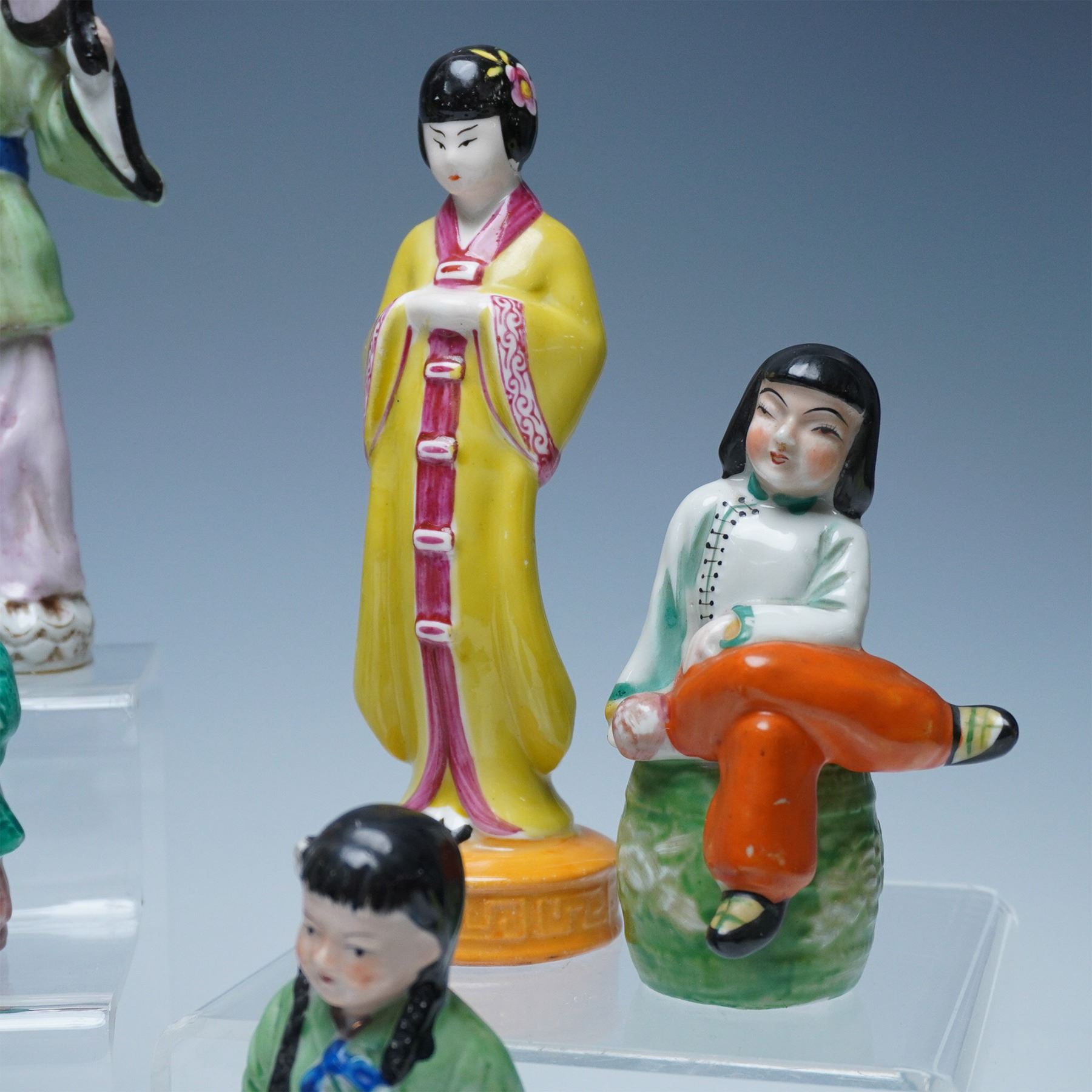 An extensive collection of hand-painted porcelain figurines, all marked "Made in Occupied Japan," dating from the post-World War II era (1945-1952). This vibrant set features a variety of figures dressed in traditional and cultural attire, including musicians, dancers, and children in expressive poses. Each figurine showcases fine detailing, intricate patterns, and bold color palettes characteristic of Japanese export porcelain from this period. These highly collectible pieces reflect the craftsmanship and artistry of the Occupied Japan era, making them an excellent addition to any vintage figurine collection. Figurines range in size from 4.25" to 8"H.