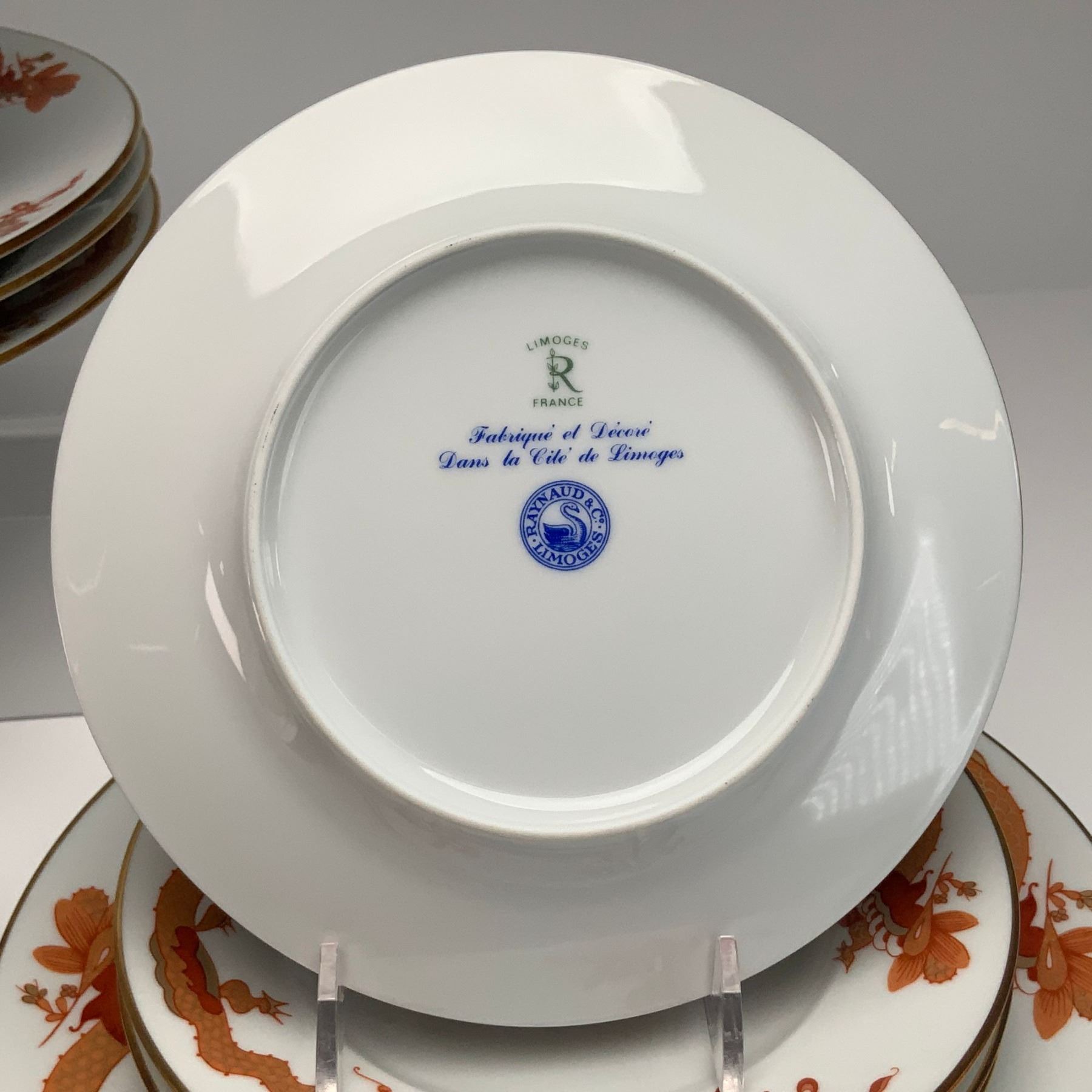 A twenty-four piece French porcelain dinnerware service produced by Raynaud & Co., Limoges, in the Red Dragon pattern. The service is decorated in an iron-red and gold palette featuring East Asian-inspired iconography, including central phoenix medallions and dragons along the borders, with gilded rims. The underside of the pieces features the letters LIMOGES above a stylized letter R and the word FRANCE, followed by cursive text reading Fabrique et Decore Dans la Cite de Limoges. A circular blue mark is also present, containing the characters RAYNAUD & Co LIMOGES surrounding a swan. The set consists of four dinner plates, four salad plates, four bowls, four bread or side plates, and four cups with four saucers.
