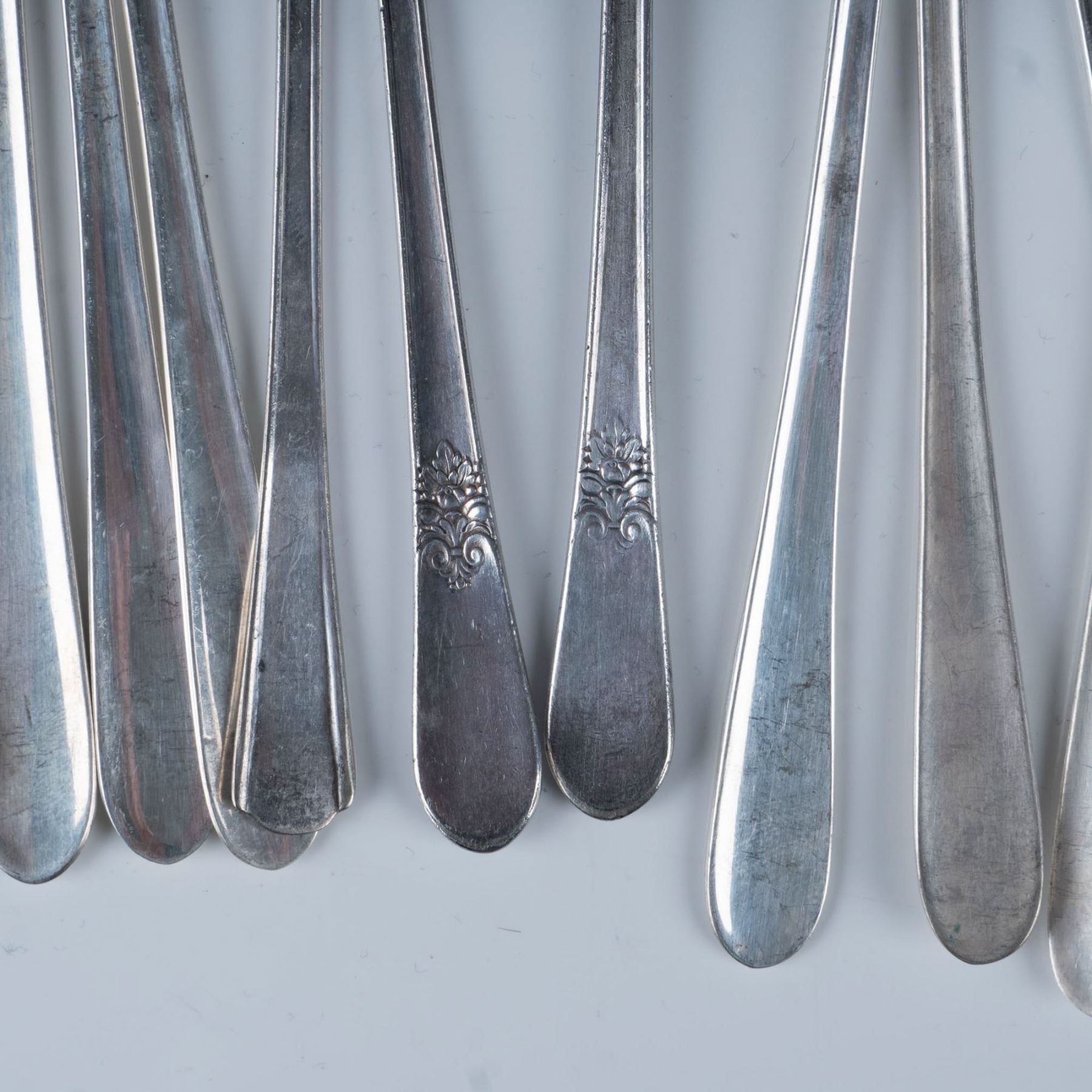 This set of 24 spoons marked 1847 Rogers Bros. IS, H. & T. MFG. Co., and Court Silverplate. All are similar in size with the longest measuring 7.75"L.