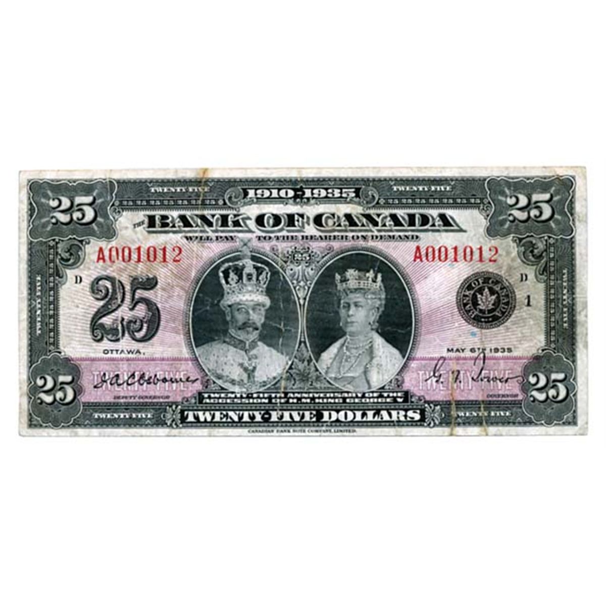 $25.00. 1935 Issue. May 6, 1935. English Text. No. A001012/D. PMG graded Net Very Good-10.