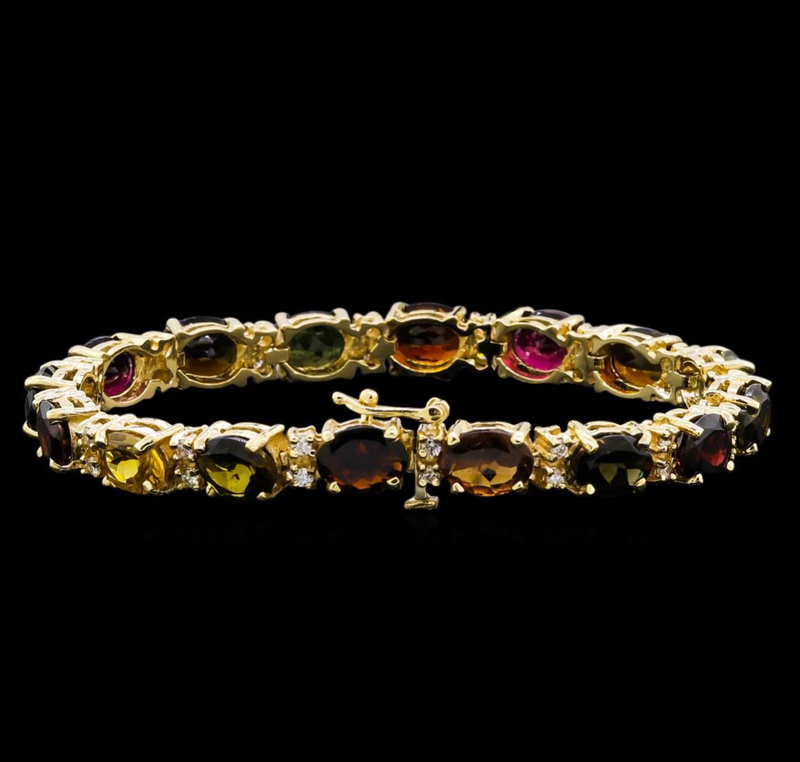 One electronically tested 14KT yellow gold lady's combination cast & assembled fashion straight line bracelet with a tongue clasp with foldover safety with a bright polish finish. The featured lady's fashion bracelet measures 7 inches in length. Identified with markings of "14K". Condition is new, good workmanship. Containing: Sixteen prong set oval modified brilliant cut natural green tourmalines, measuring 8.40 x 6.50 x 4.23mm, (depth est.) approximate total weight of 25.05ct., clarity is eye clean, cut is very good. The featured lady's bracelet has tourmaline ranging in color from green to orange to orange red to red. Transmitting light with a minimum of distortion, transparent. Colored gemstones are presumed to have been subjected to commonly used enhancement processes. Graded in the setting. Thirty-Two prong set round brilliant cut diamonds, measuring 1.90 - 1.85 x 1.13mm (depth est.) approximate total weight of 32 Stones = 0.78ct. Graded in the setting. Clarity: VS-2 to SI-2. Color: H - I. Cut Good. Total Weight of Colored Stones 25.05ct. Total Weight of Diamonds 0.78ct. Total Weight of Bracelet 21.10gm. GAS Appraised at $7,530.00.