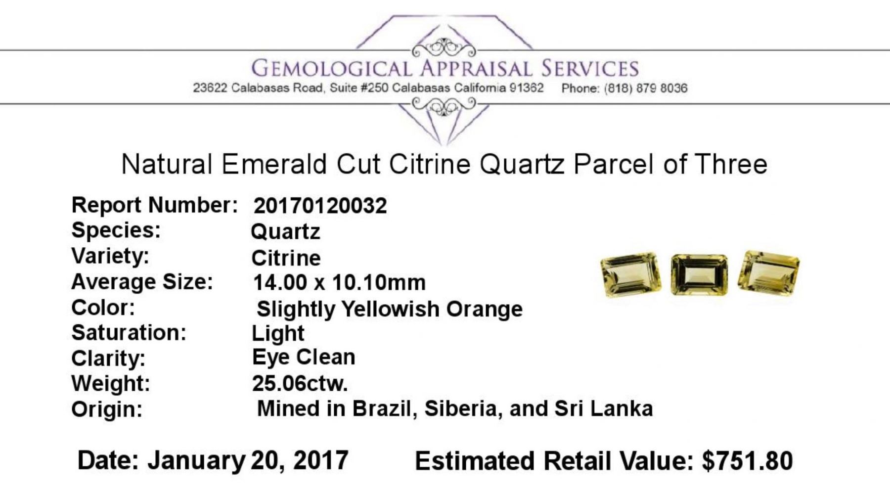 One natural emerald cut citrine quartz parcel of three with an exact weight of 25.06ctw., clarity is eye clean, slightly yellowish orange, light. Gemological Appraisals Services estimates the retail value at $751.8 GAS Appraised.