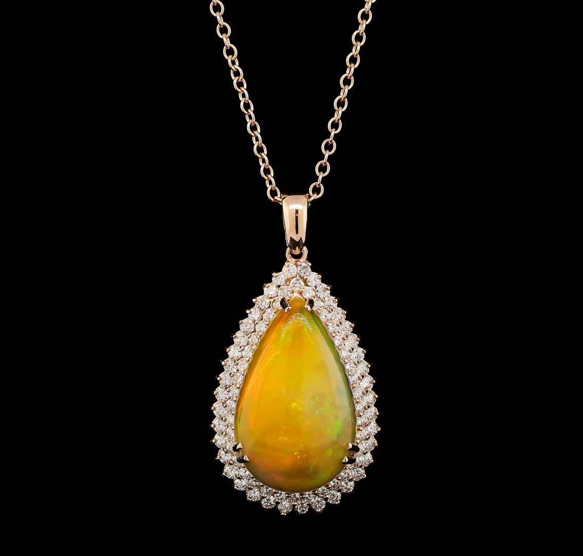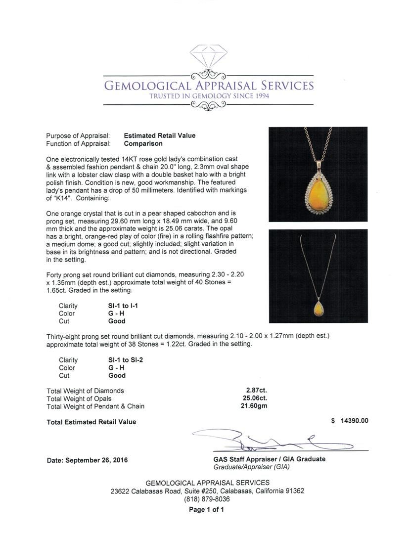 One electronically tested 14KT rose gold lady's combination cast & assembled fashion pendant & chain 20.0' long, 2.3mm oval shape link with a lobster claw clasp with a double basket halo with a bright polish finish. The featured lady's pendant has a drop of 50 millimeters. Identified with markings of 'K14'. Condition is new, good workmanship. Containing: One orange crystal that is cut in a pear shaped cabochon and is prong set, measuring 29.60 mm long x 18.49 mm wide, and 9.60 mm thick and the approximate weight is 25.06 carats. The opal has a bright, orange-red play of color (fire) in a rolling flashfire pattern; a medium dome; a good cut; slightly included; slight variation in base in its brightness and pattern; and is not directional. Graded in the setting. Forty prong set round brilliant cut diamonds, measuring 2.30 - 2.20 x 1.35mm (depth est.) approximate total weight of 40 Stones = 1.65ct. Graded in the setting. Clarity SI-1 to I-1. Color: G - H Cut Good Thirty-Eight prong set round brilliant cut diamonds, measuring 2.10 - 2.00 x 1.27mm (depth est.) approximate total weight of 38 Stones = 1.22ct. Graded in the setting. Clarity SI-1 to SI-2. Color: G - H Cut Good. Total Weight of Diamonds 2.87ct.. Total Weight of Opals 25.06ct.. Total Weight of Pendant & Chain 21.60gm. GAS Appraised at $14,390.00.
