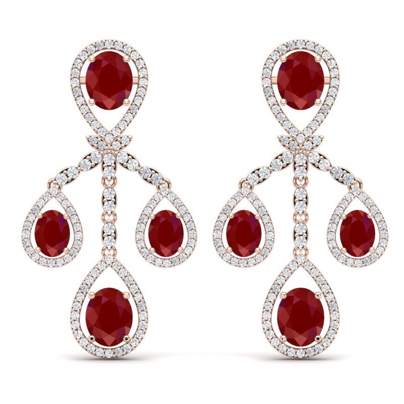 25.08 CTW Royalty Designer Ruby & VS Diamond Earrings 18K Rose Gold ---- Luxury Designer Brand Earring Appraised Retail Price at $37,800 ---- SKU Number US38575 18K Rose gold Earring Size is Larger, Earring measuring approx. 2 x 1 1/2 Inches, weighing in total approx. 20 grams. Made in the USA and is stamped 18K, Main stone 13.6 carat total weight containing 4 pieces of Intense Mid-Opaque Red color with AAA quality Oval shape cut Ruby , Stone #2 7 carat total weight containing 4 pieces of Intense Mid-Opaque Red color with AAA quality Oval shape cut