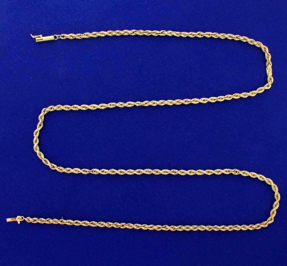 In 14k yellow gold, 25 3/4 inch long and 3.2mm wide with safety clasp. 8.0g.