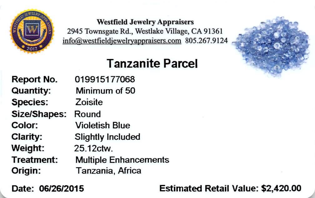 Fifty round mixed cut natural tanzanites, measuring 2.00 - 2.00 x 1.30 mm, exact total weight 25.12ct., clarity is slightly included, type I, medium light, very slightly grayish, violetish blue color, (GIA vB 4/3), cut is good. Measurements & the color grade are an average for the group, Color grade is an average for the group, Transmitting light with no distortion, transparent, Naturally occurring internal & external characteristics are present, Indications of multiple laboratory enhancements, including high temperature heat treatment. Westfield Appraised at $2,420.00.