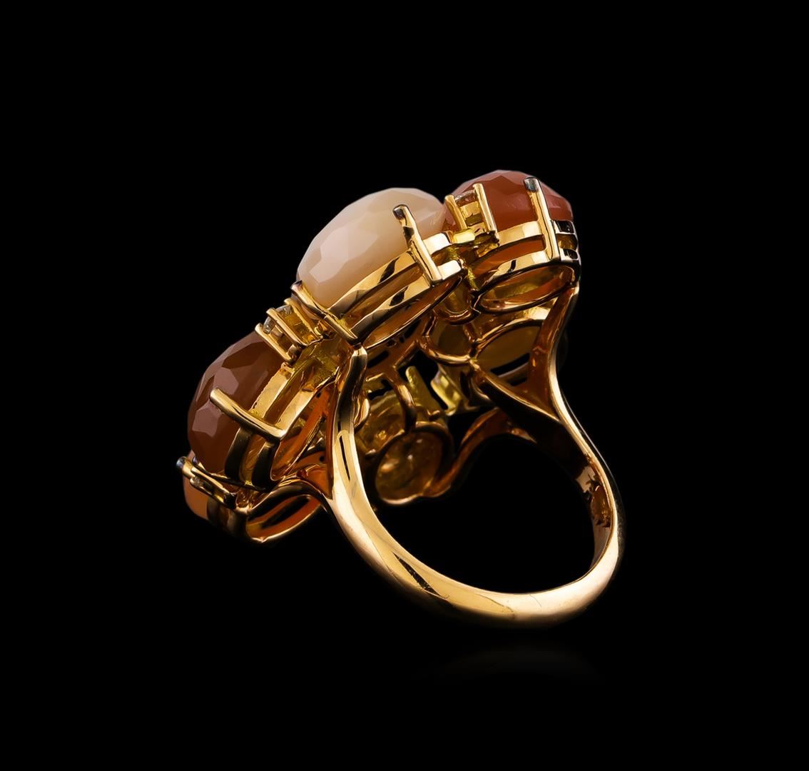 One electronically tested 18KT yellow gold ladies cast & assembled multi color sunstone and diamond ring with a bright and anodized finish. The ring features a stylized multi color sunstone cluster supported by diamond accents, completed by a three millimeter wide band. Trademark is ZEN. Identified with markings of "750". Condition is new, good workmanship. Containing: Six prong set oval cabochon cut natural multi color sunstones, measuring 11.00 x 9.00 x 6.00mm, approximate total weight of 25.14ct., clarity is heavily included, cut is good. Transmitting light somewhat diffusely, translucent. Naturally occurring internal & external characteristics are present. Measurements are an average for the group. The group is composed of a mix of natural red, orangy red, orange and yellowish orange color sunstone. Graded in the setting. Eight prong set round brilliant cut diamonds, measuring 2.40 - 2.20 x 1.38mm (depth est.) approximate total weight of 8 Stones = 0.45ct. Graded in the setting. Clarity: SI-1 to SI-2. Color: G - H Thirty prong set round brilliant cut diamonds, measuring 1.20 - 1.10 x 0.69mm (depth est.) approximate total weight of 30 Stones = 0.23ct. Graded in the setting. Clarity: SI-1 to SI-2. Color: G - H. Total Weight of Colored Stones 25.14ct. Total Weight of Diamonds 0.68ct. Total Weight of Ring 16.77gm. AIG Appraised at $5,435.00.