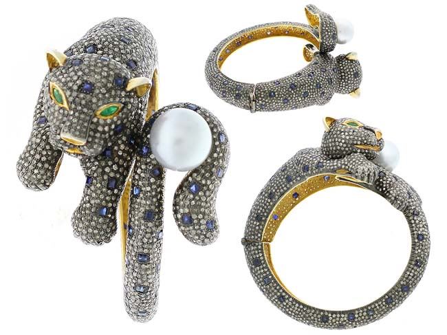 25.17 TCW TIGER SHAPE BLUE SAPPHIRE ,PEARL & DIAMOND BANGLE 14K GOLD & SILVER