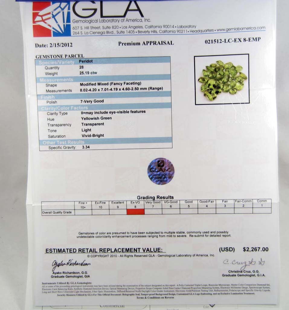 Comes w/ GLA Appraisal of $2,267.00. 28 mixed Peridots. Overall quality is 8.