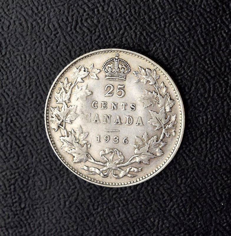 Canada 25¢, 1936 "Dot", VF-30 with traces of peripheral lustre. A challenge to find in this grade.