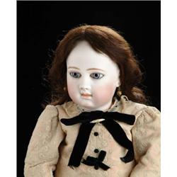 25” 1st SERIES PORTRAIT JUMEAU BEBE INCISED “5.” On original body stamped “JUMEAU MEDAILLE D’OR PARIS,” with eight loose ball joints and oversized hands. This is one of the earliest and most desirable of all the Jumeau children, with bulbous blue threaded paperweight eyes that are an extreme almond shape, shaded in mauve on upper lids. Extremely pale bisque with contrasting rosy cheeks and chin, wearing antique dark brown human hair wig over cork pate, dressed in a multi-colored pink silk dress overlaid by embroidered flowers and trimmed with black velvet ribbon and buttons. Black cotton socks and black oilcloth sandals complete the look. CONDITION: Superior quality bisque, 1” shrinkage line at upper left rim edge. Body torso finish original, but arms and legs repainted. RS 1-3552 (15,000-20,000)