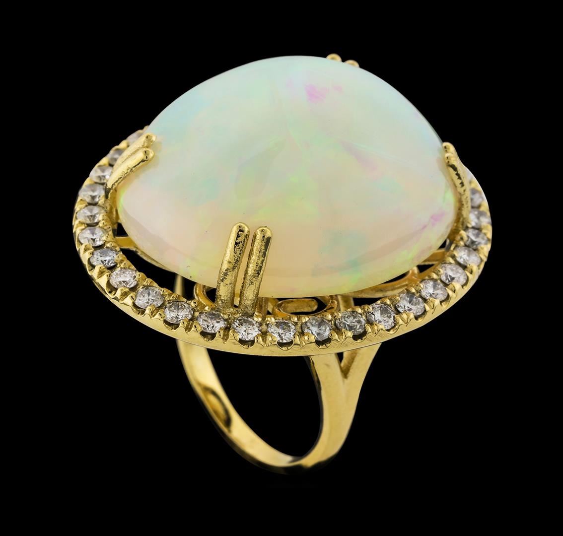 One electronically tested 14KT yellow gold lady's cast fashion ring with a halo with a bright polish finish. The featured lady's ring has a shank measuring 2.00 millimeters wide. Identified with markings of '14K'. Condition is new, good workmanship. Containing: One crystal opal that is cut in a oval shaped cabochon and is prong set, measuring 26.40 mm long x 22.58 mm wide, and 11.75 mm thick and the approximate weight is 25.20 carats. The opal has a very bright, multicolor play of color (fire) in a rolling flashfire pattern; a high dome; a good cut; no inclusions; consistent in its brightness and pattern; and is not directional. Graded in the setting. Thirty-Four prong set round brilliant cut diamonds, measuring 2.30 - 2.20 x 1.40mm (depth est.) approximate total weight of 34 Stones = 1.48ct. Graded in the setting. Clarity SI-1 to SI-2. Color: G - I Cut Good. Total Weight of Diamonds 1.48ct.. Total Weight of Opals 25.20ct.. Total Weight of Ring 16.40gm. GAS Appraised at $12,140.00.