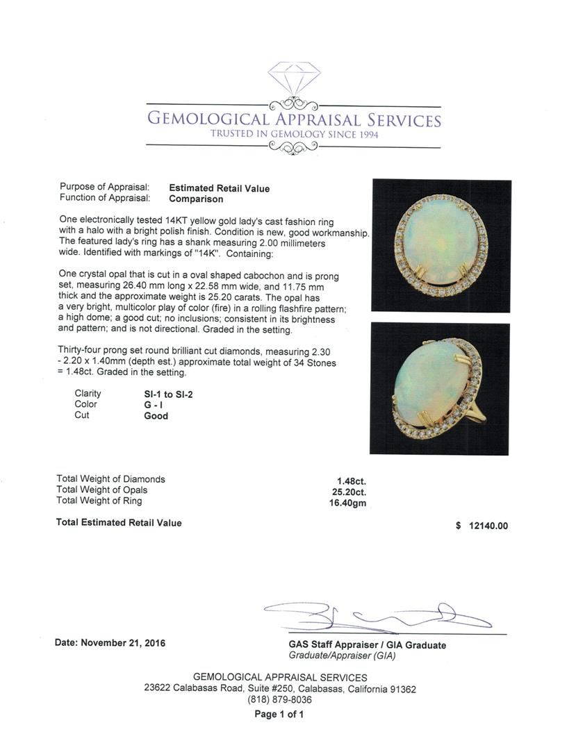 One electronically tested 14KT yellow gold lady's cast fashion ring with a halo with a bright polish finish. The featured lady's ring has a shank measuring 2.00 millimeters wide. Identified with markings of '14K'. Condition is new, good workmanship. Containing: One crystal opal that is cut in a oval shaped cabochon and is prong set, measuring 26.40 mm long x 22.58 mm wide, and 11.75 mm thick and the approximate weight is 25.20 carats. The opal has a very bright, multicolor play of color (fire) in a rolling flashfire pattern; a high dome; a good cut; no inclusions; consistent in its brightness and pattern; and is not directional. Graded in the setting. Thirty-Four prong set round brilliant cut diamonds, measuring 2.30 - 2.20 x 1.40mm (depth est.) approximate total weight of 34 Stones = 1.48ct. Graded in the setting. Clarity SI-1 to SI-2. Color: G - I Cut Good. Total Weight of Diamonds 1.48ct.. Total Weight of Opals 25.20ct.. Total Weight of Ring 16.40gm. GAS Appraised at $12,140.00.