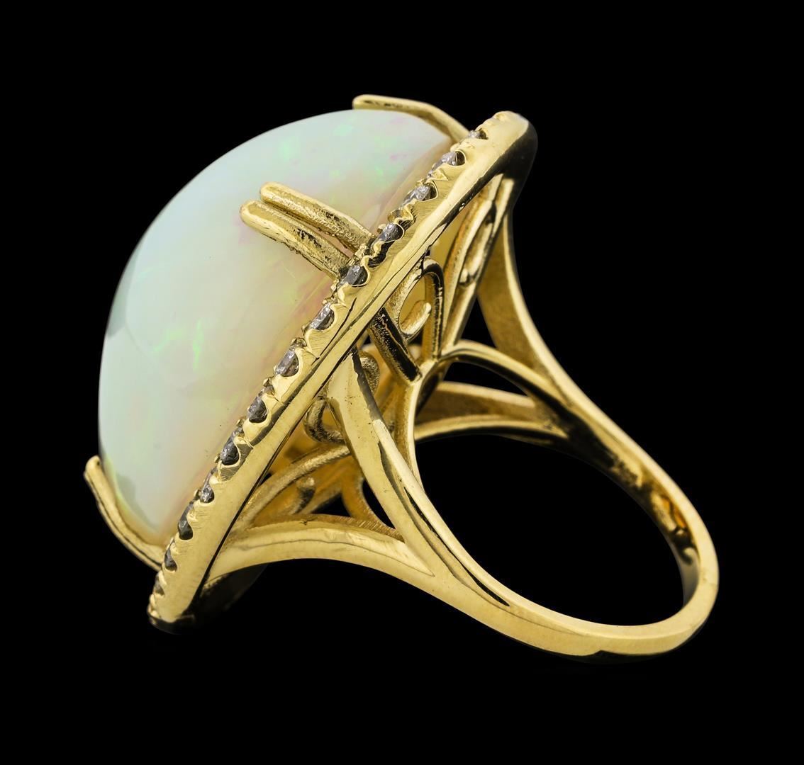 One electronically tested 14KT yellow gold lady's cast fashion ring with a halo with a bright polish finish. The featured lady's ring has a shank measuring 2.00 millimeters wide. Identified with markings of '14K'. Condition is new, good workmanship. Containing: One crystal opal that is cut in a oval shaped cabochon and is prong set, measuring 26.40 mm long x 22.58 mm wide, and 11.75 mm thick and the approximate weight is 25.20 carats. The opal has a very bright, multicolor play of color (fire) in a rolling flashfire pattern; a high dome; a good cut; no inclusions; consistent in its brightness and pattern; and is not directional. Graded in the setting. Thirty-Four prong set round brilliant cut diamonds, measuring 2.30 - 2.20 x 1.40mm (depth est.) approximate total weight of 34 Stones = 1.48ct. Graded in the setting. Clarity SI-1 to SI-2. Color: G - I Cut Good. Total Weight of Diamonds 1.48ct.. Total Weight of Opals 25.20ct.. Total Weight of Ring 16.40gm. GAS Appraised.