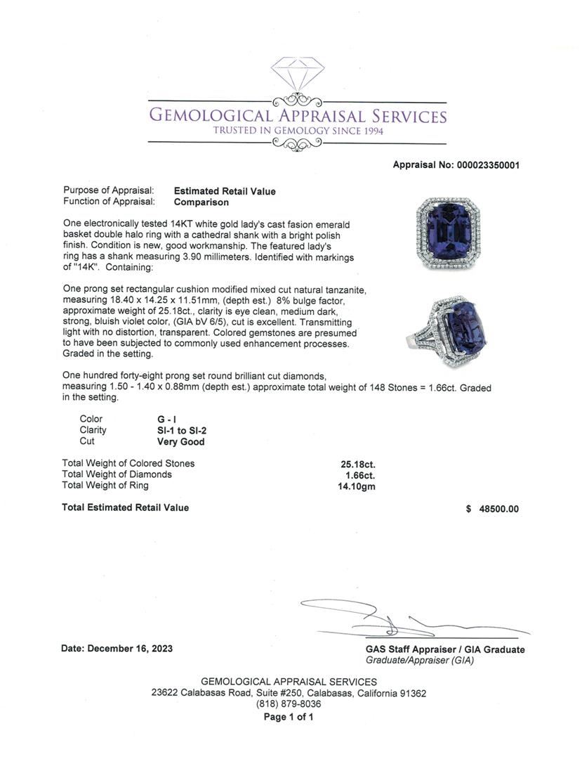 One electronically tested 14KT white gold lady's cast fashion emerald basket double halo ring with a cathedral shank with a bright polish finish. The featured lady's ring has a shank measuring 3.90 millimeters. Identified with markings of "14K". Condition is new, good workmanship. Containing: One prong set rectangular cushion modified mixed cut natural tanzanite, measuring 18.40 x 14.25 x 11.51mm, (depth est.) 8% bulge factor, approximate weight of 25.18ct., clarity is eye clean, medium dark, strong, bluish violet color, (GIA bV 6/5), cut is excellent. Transmitting light with no distortion, transparent. Colored gemstones are presumed to have been subjected to commonly used enhancement processes. Graded in the setting. One Hundred Forty-Eight prong set round brilliant cut diamonds, measuring 1.50 - 1.40 x 0.88mm (depth est.) approximate total weight of 148 Stones = 1.66ct. Graded in the setting. Color G - I Clarity SI-1 to SI-2 Cut Very Good Total Weight of Colored Stones 25.18ct. Total Weight of Diamonds 1.66ct. Total Weight of Ring 14.10gm Estimated Retail Value $ 48500.00
